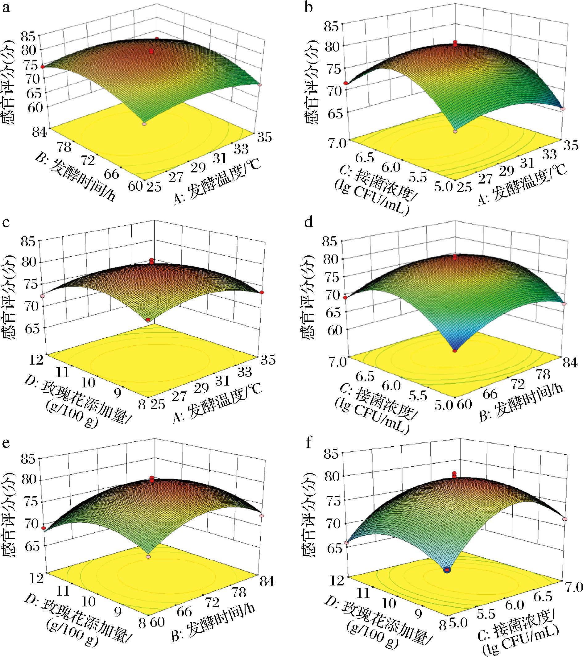 a-发酵温度与发酵时间;b-发酵温度与接菌浓度;c-发酵温度与玫瑰花添加量;d-发酵时间与接菌浓度;e-发酵时间与玫瑰花添加 量;f-接菌浓度与玫瑰花添加量