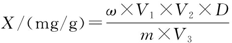 式中:ω,试样测定液中单宁酸的含量,mg/g;V1,试样提取定容体积,mL;V2,测试定容体积,mL;V3,测试吸取体积,mL;D,试样稀释倍数;m,试样质量,g。