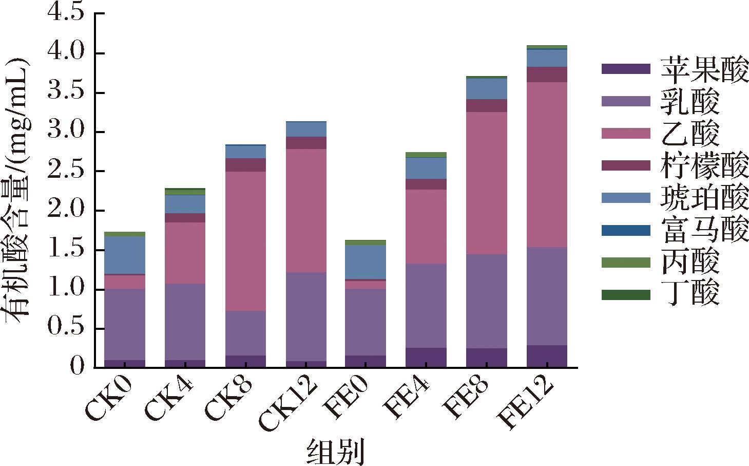 鱼椒酸发酵过程中总酸和pH值的变化如图2所示。随着发酵进行,2组总酸(total acid,TA)含量均有所上升,pH值相应下降,区别在于发酵初期FE组的产酸速率显著高于CK组。发酵第4天,CK组的pH值为4.08±0.10,总酸含量为(2.35±0.13) g/kg,而FE组的pH值为3.85±0.06,总酸含量为(2.97±0.13) g/kg。发酵第12天,CK组和FE组的总酸含量分别为(4.99±0.13) g/kg和(4.82±0.12) g/kg。这是由于FE组中L.plantarum和W.cibaria的生长和代谢活动占据优势地位,因此产酸的速度也更快。到了发酵后期,由于O2的减少和营养物质的消耗,优势乳酸菌L.plantarum和W.cibaria的生长逐渐变慢,产酸速率逐渐变缓。与单独接种Y279发酵的鱼椒酸相比,混合接种Y279和Y113发酵的样品具有更高的总酸含量[16]。这表明混菌发酵时,有机酸的产生可能受到菌株协同作用或代谢途径差异表达的影响。