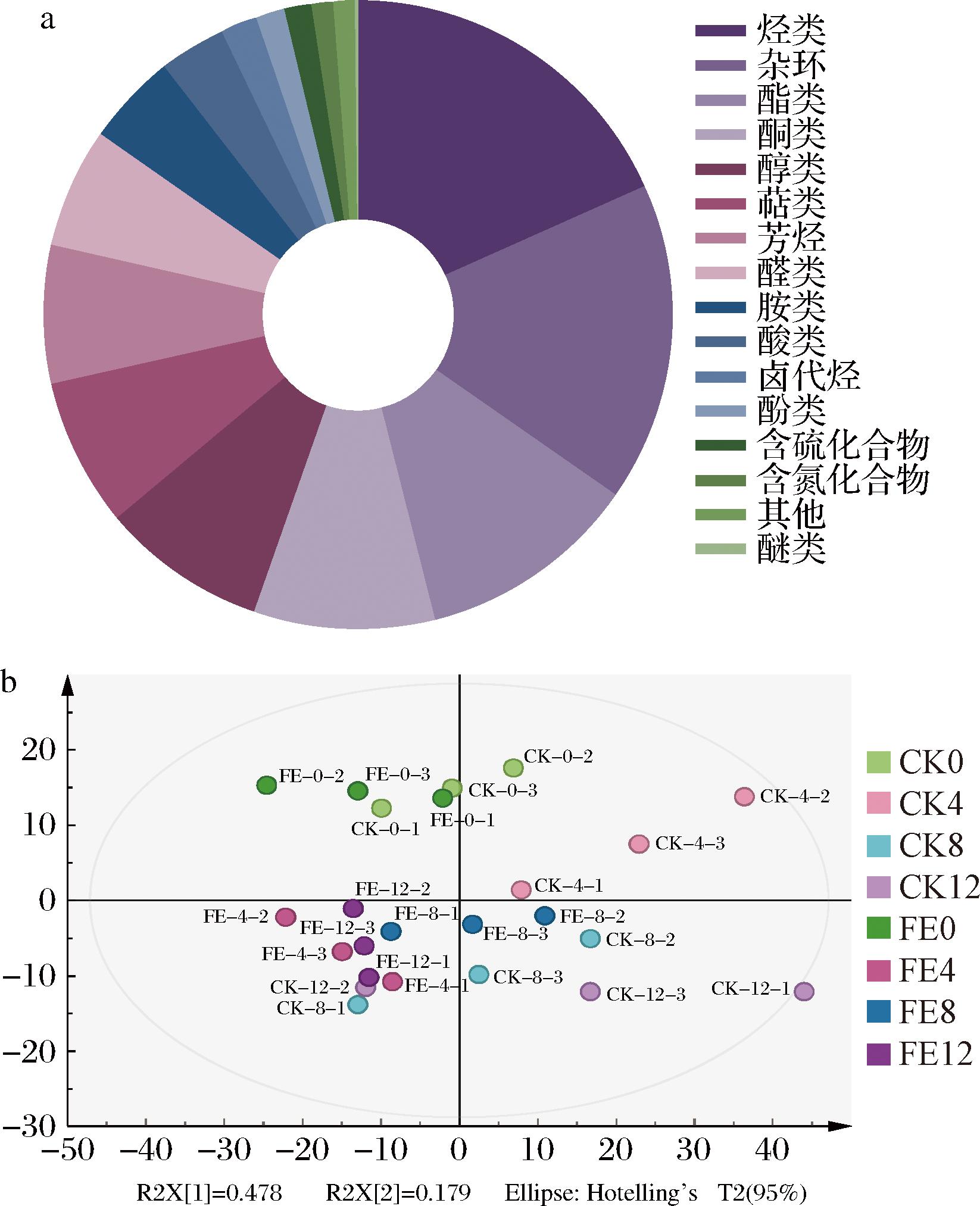 挥发性风味化合物是发酵食品特色风味形成的关键。采用顶空固相微萃取结合气相色谱质谱联用(headspace solid-phase microextraction-gas chromatography-mass spectrometry,HS-SPME-GC-MS)技术分析了CK组和FE组处于不同发酵阶段的挥发性风味化合物。如图5-a所示,从8个样品中共检测出645种挥发性物质,包括烃类118种、杂环化合物106种、酯类73种、酮类60种、醇类55种、萜类49种、芳烃类46种、醛类40种、胺类30种、酸类22种、卤代烃12种、酚类10种、含硫化合物9种、含氮化合物7种、其他7种、醚类1种。主成分分析图如图5-b所示,第1主成分解释了方差的47.8%,第2主成分解释了17.9%,由图可知,与CK组相比,FE组中FE4、FE8、FE12的样品之间间距更短。这表明接种乳酸菌强化发酵的鱼椒酸样品间挥发性风味化合物差异小,更稳定。
