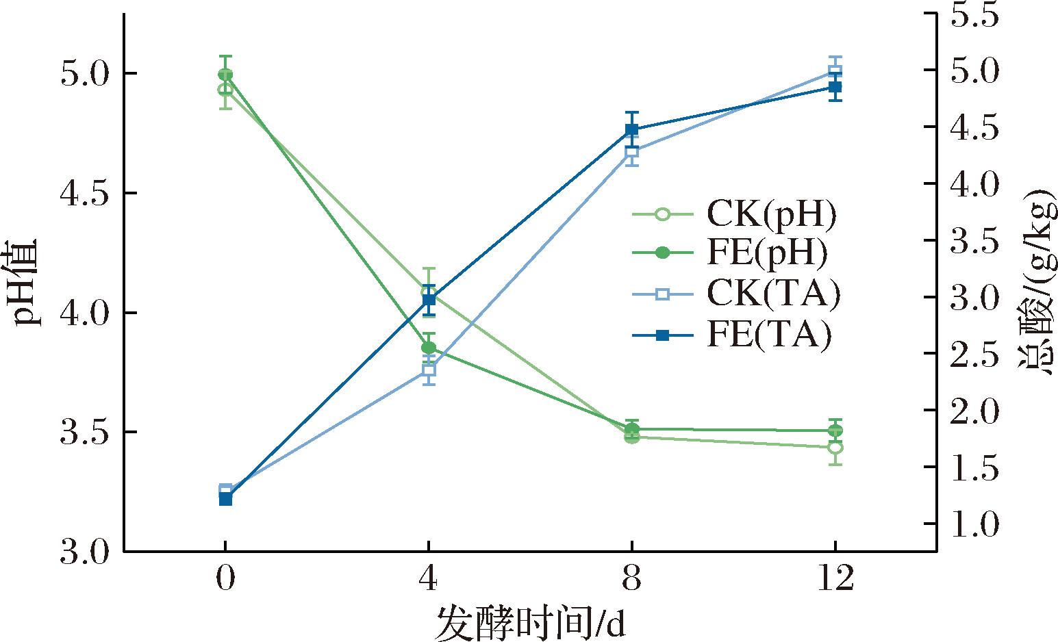 Fig.2 Dynamic changes in total acid content and pH value during fermentation of YJS in the CK and FE groups
