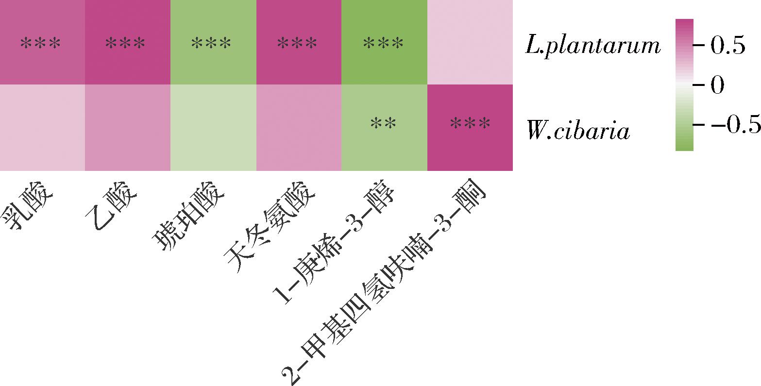 对优势细菌(L.plantarum和W.cibaria)和特征风味物质(乳酸、乙酸、琥珀酸、谷氨酸、天冬氨酸及14种关键风味化合物)之间进行Spearman相关性分析(以P<0.05、r>|0.6|为显著相关),有助于了解优势细菌在鱼椒酸的特色风味形成中的作用。如图6所示,L.plantarum与乳酸、乙酸、天冬氨酸呈现显著正相关,与琥珀酸、1-庚烯-3-醇呈现显著负相关;W.cibaria仅与2-甲基四氢呋喃-3-酮呈现显著正相关,与1-庚烯-3-醇呈现显著负相关。由此可知,优势细菌的生长变化可能会对部分风味物质的生成和积累产生显著影响,并且L.plantarum影响非挥发性风味物质,而W.cibaria影响挥发性风味物质。综上所述,接种乳酸菌强化发酵鱼椒酸可以影响发酵过程中酸味、鲜味、黄油香气的产生。