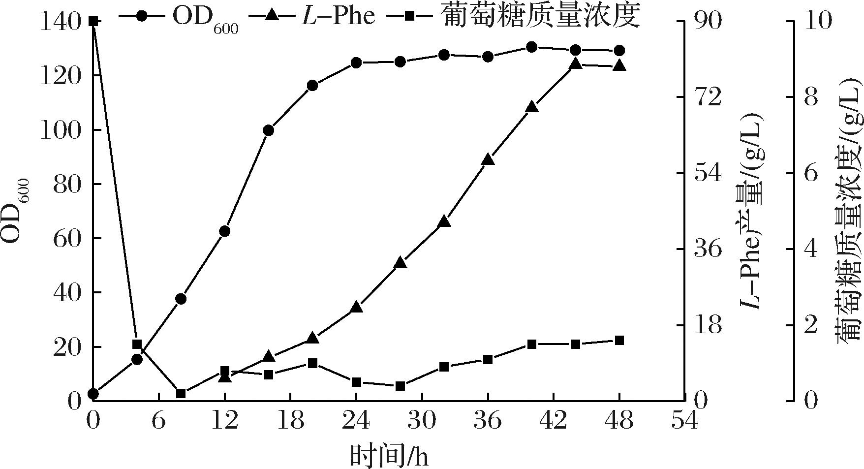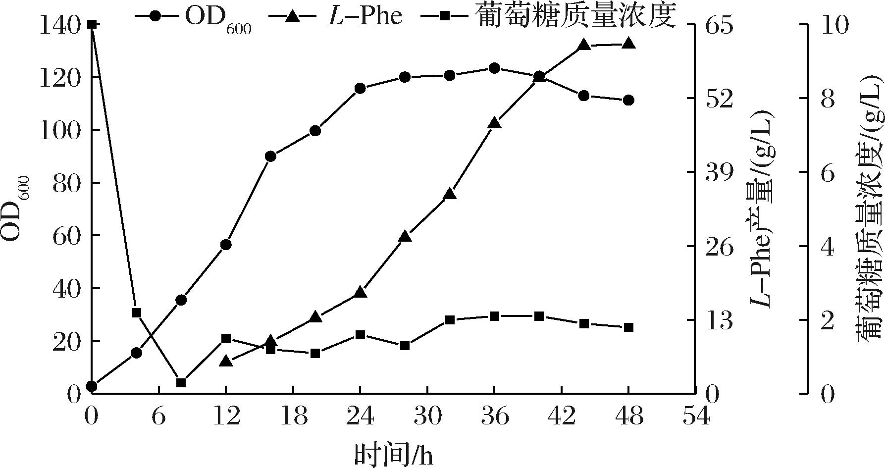 为了对工程菌株的生产性能进行进一步评估,将菌株PHE-50在5 L发酵罐中进行分批补料发酵。发酵过程曲线如图6所示,菌体生物量在发酵初期迅速积累,在24 h后进入稳定期,36 h时OD600值达到最高为123.35,随后OD600值不断下降;经48 h发酵,L-Phe产量达61.49 g/L,糖酸转化率为20%,生产强度为1.28 g/(L·h)。