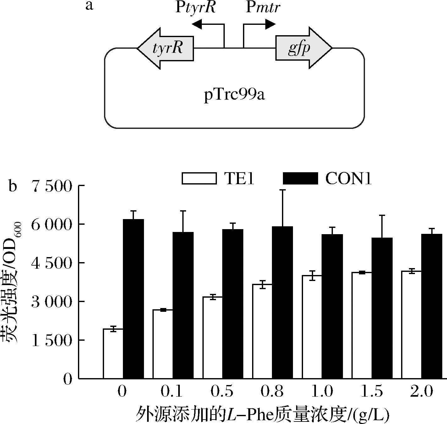 采用无缝克隆法构建具有L-Phe感应功能的质粒pTE1。利用Prime STAR HS DNA聚合酶,通过PCR扩增线性化载体pTrc99a(引物分别为99a-S和99a-A)、PtyrR-tyrR片段(以W3110基因组为模板,引物分别为tyrR-mtr-S和tyrR-mtr-S)、用引物Pmtr-tyrA-S和gfp-99a-A扩增Pmtr-gfp片段。利用ClonExpress Ⅱ One Step Cloning Kit酶对质粒和目的片段进行同源重组得到质粒pTE1。将质粒pTE1和阳性对照质粒pCON1,分别转化至野生型大肠杆菌W3110,形成菌株TE1和CON1。两菌株分别接种至含有100 mg/L氨苄青霉素的LB培养基中,在37 ℃、250 r/min下培养12 h后,分别接种至含5 mL的MY1培养基的摇管中并保持初始OD600值为0.3。分别向培养基中加入不同浓度的L-Phe(L-Phe最终质量浓度分别为0、0.1、0.5、0.8、1、1.5、2 g/L),培养16 h后,测定细胞密度和荧光强度(激发波长488 nm,发射波长511 nm)。