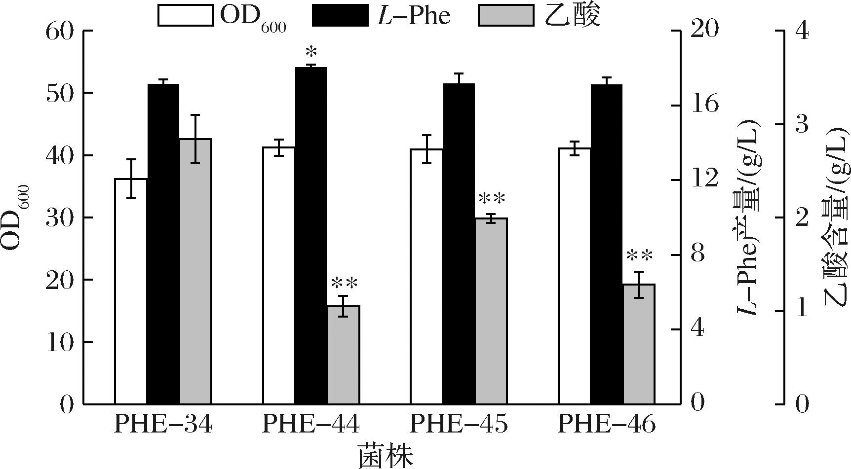 菌株发酵培养过程中,糖酵解途径与产物合成途径不平衡会导致副产物乙酸积累,对菌体生长和生产效率造成不良影响[21],造成碳源浪费而降低L-Phe的得率。乙酸的合成主要通过2种代谢途径,一是由丙酮酸在丙酮酸氧化酶PoxB的催化下获得,二是乙酰辅酶A通过Pta-AckA途径获得。为降低乙酸的生成,本研究在菌株PHE-34的基础上分别失活乙酸激酶编码基因ackA(PHE-44)、丙酮酸氧化酶编码基因poxB(PHE-45)和磷酸乙酰转移酶编码基因pta(PHE-46),探究各靶点的敲除对菌株的细胞生长、乙酸和L-Phe合成的影响。