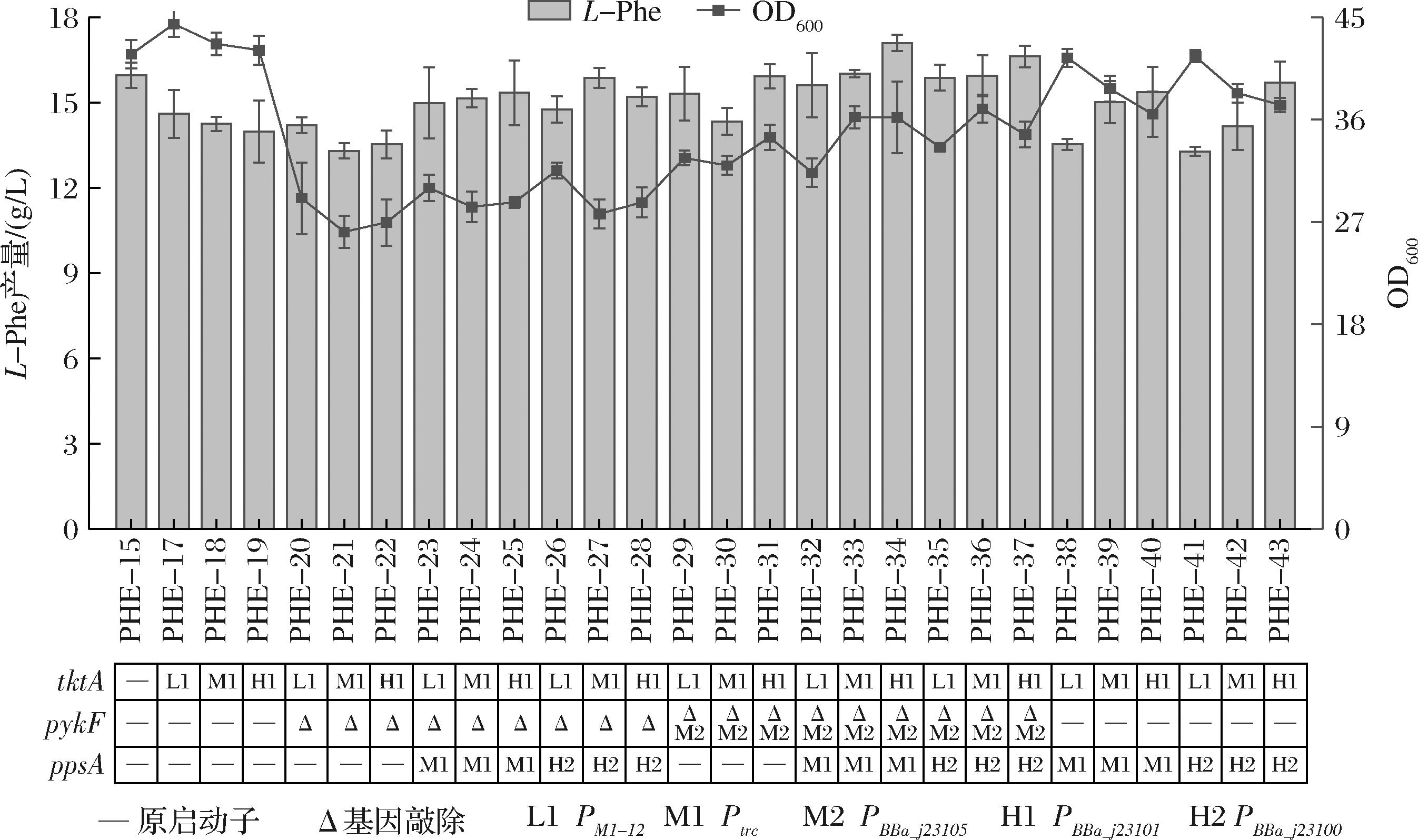 PEP和E4P是莽草酸途径的重要前体,其二者的供应是L-Phe生产的瓶颈之一。其中PEP既参与DAHP的合成,又可以被丙酮酸激酶催化生成丙酮酸而进入三羧酸循环,同时参与PTS代谢等,被多条途径分流,因此其进入莽草酸途径的代谢流受到一定影响。为了提高PEP的供应,本研究尝试弱化或敲除编码丙酮酸激酶的pykF基因,并强化编码磷酸烯醇式丙酮酸合成酶基因ppsA;同时,由于PEP与E4P协同反应缩合形成DAHP,尝试通过适当过表达转酮酶基因tktA增强E4P的合成,平衡E4P与PEP的供应,从而优化碳通量。