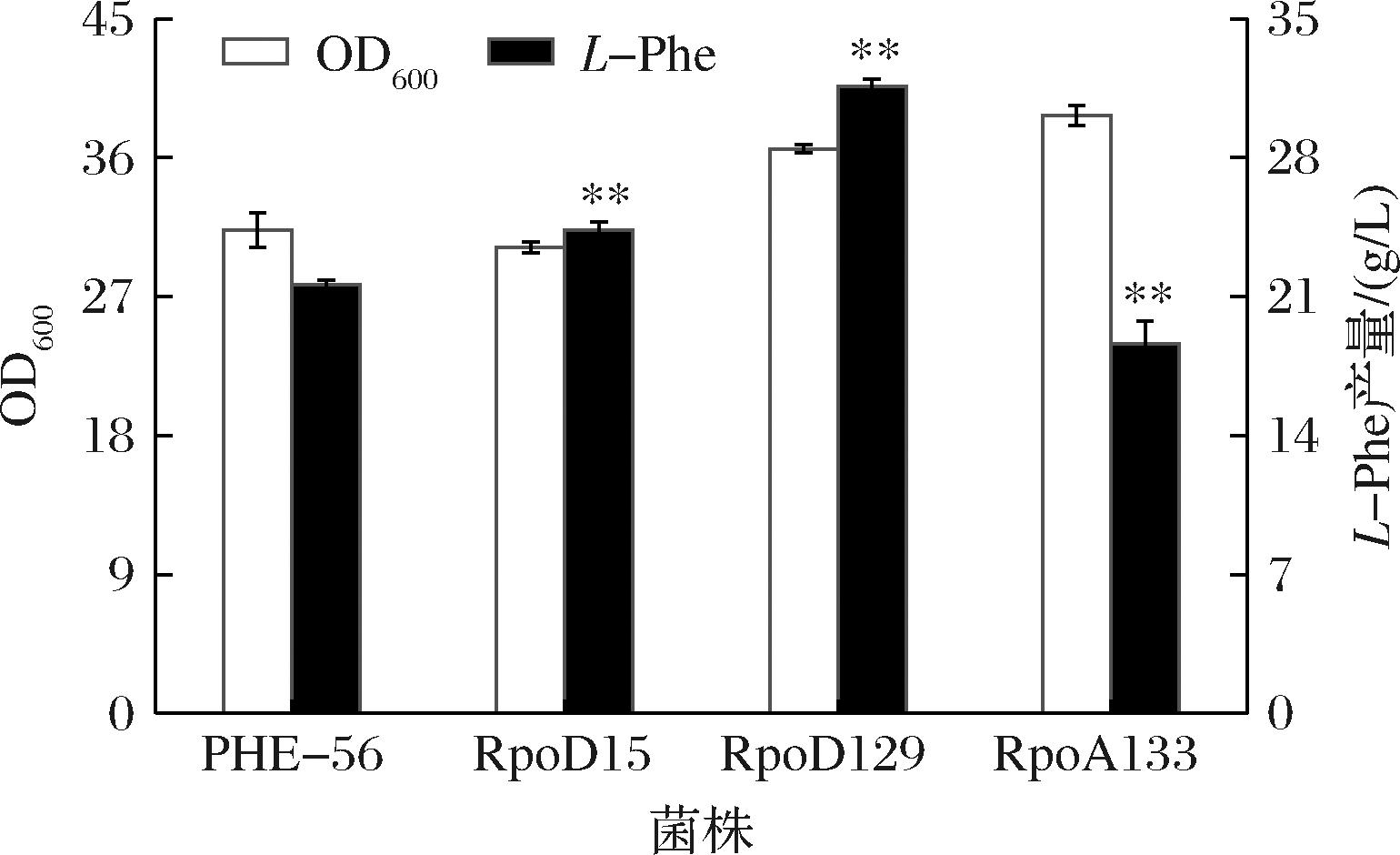 为了确定RpoD129的突变体特征,对其携带的pSL2质粒进行测序,结果表明,在启动子和RpoD编码区共有49个单碱基突变位点。据报道,RpoD作为重要σ70因子,协同全局转录因子构成gTME的调控网络,对1 000多个基因的转录水平有调节作用[25];RpoD中的大量点突变对工程菌的代谢网络造成扰动,可能改变菌体生长、L-Phe合成以及菌体抗逆性等相关基因的转录水平,从而实现菌株生产性能的强化。
