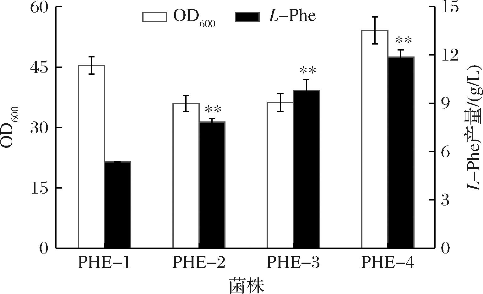 本研究构建解除反馈抑制的pheAfbr片段(即删除了pheA基因序列的后260 bp),由启动子Ptrc控制整合到野生型大肠杆菌W3110的tyrR基因位点上,得到菌株PHE-1。在此基础上,整合Ptrc启动子控制的解除反馈抑制的aroGfbr基因(即aroG基因第436位碱基由G变为A),得到菌株PHE-2。为进一步强化代谢通量,在菌株PHE-2基因组上继续整合pheAfbr和aroGfbr基因,分别得到菌株PHE-3和PHE-4。摇瓶发酵结果如图2所示,PHE-4的产量为11.86 g/L,较PHE-1提高了121.27%,较PHE-2提高了51.27%,较PHE-3提高了21.39%,说明解除AroG和PheA的反馈抑制能有效提高L-Phe产量,且适当提高表达量有利于L-Phe的合成。