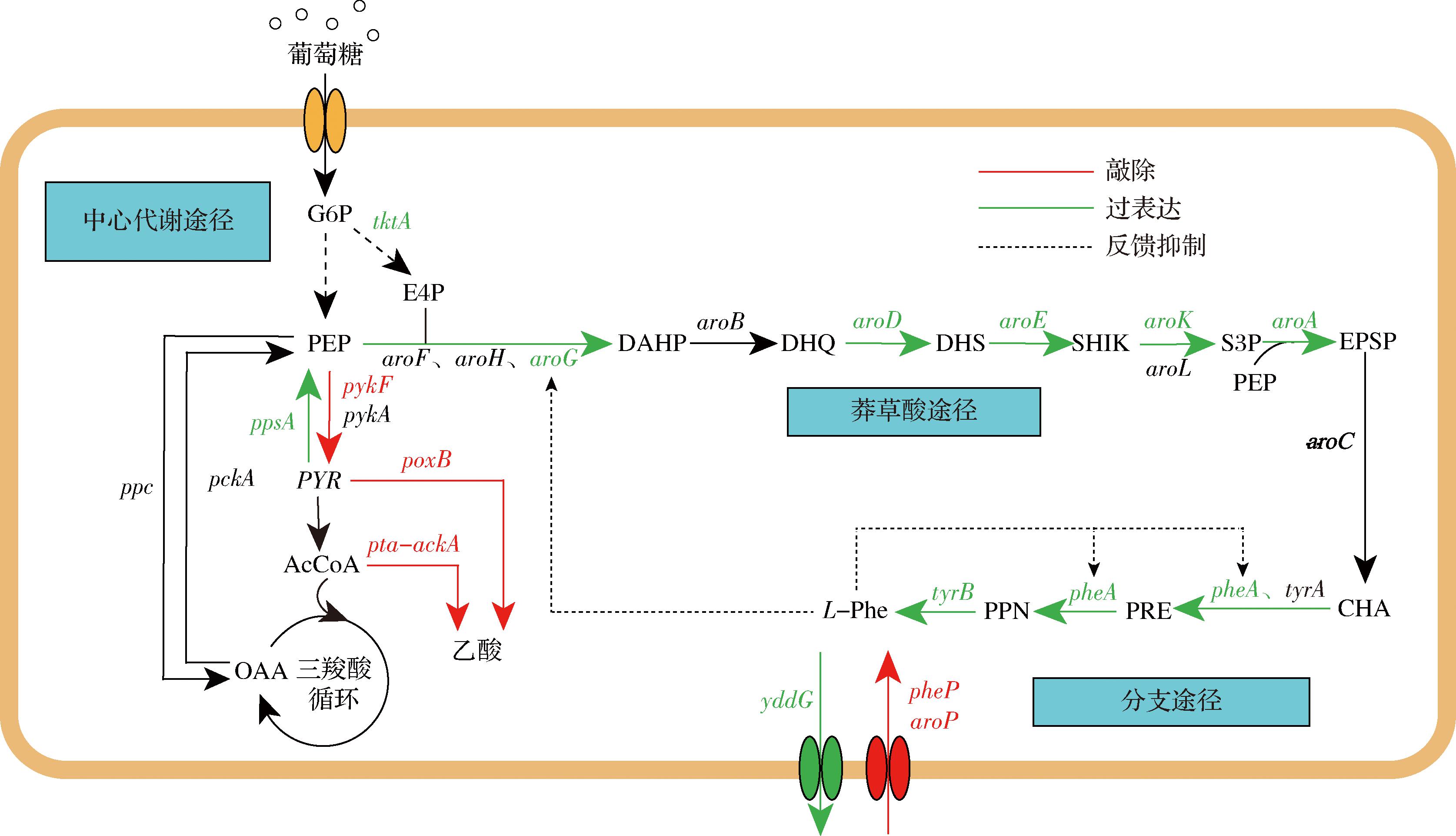 注:G6P-6-磷酸葡萄糖;PEP-磷酸烯醇式丙酮酸;E4P-4-磷酸赤藓糖;PYR-丙酮酸;AcCoA-乙酰辅酶A;OAA-草酰乙酸;DAHP-3-脱氧-α阿拉伯庚酮糖-7-磷酸;DHQ-3-脱氢奎宁酸;DHS-3-脱氢莽草酸;SHIK-莽草酸;S3P-3-磷酸莽草酸;EPSP-5-烯醇丙酮莽草酸-3-磷酸; CHA-分支酸;PRE-预苯酸;PPN-苯丙酮酸。
