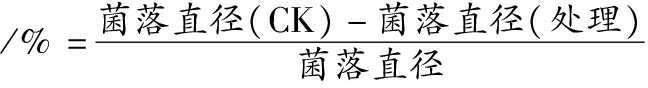 通过打孔法进行抑菌活性评价试验。WX-1在37 ℃培养12 h,离心收集上清液,将无细胞上清液通过0.22 μm无菌膜过滤以获得不含细胞的无细胞上清液。以金黄色葡萄球菌为指示菌(1×106 CFU/mL),均匀涂抹在固体培养基上,打孔后于孔洞中注入100 μL上清液,37 ℃培养24 h,测定抑菌圈的直径并按公式(1)计算抑菌率[16]。
