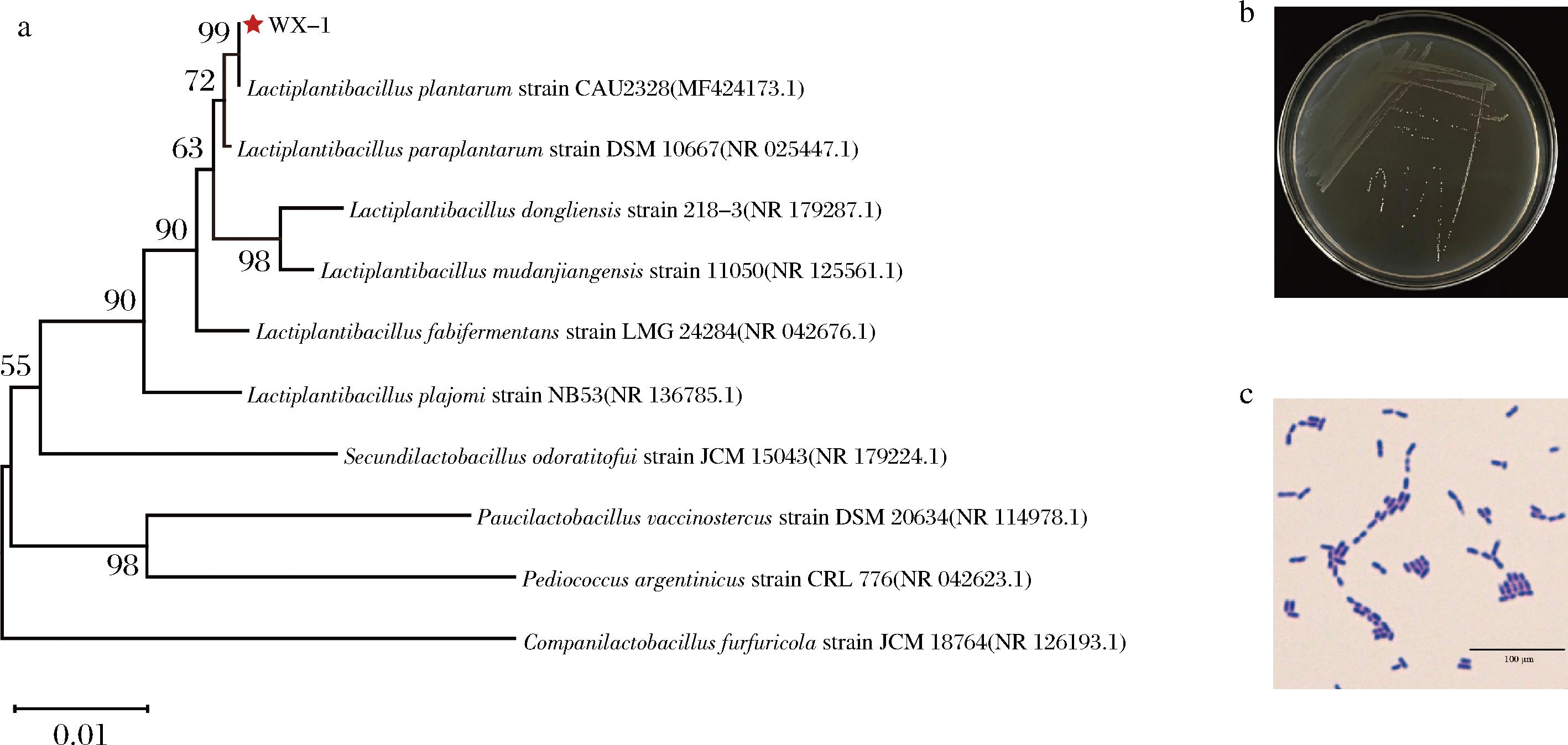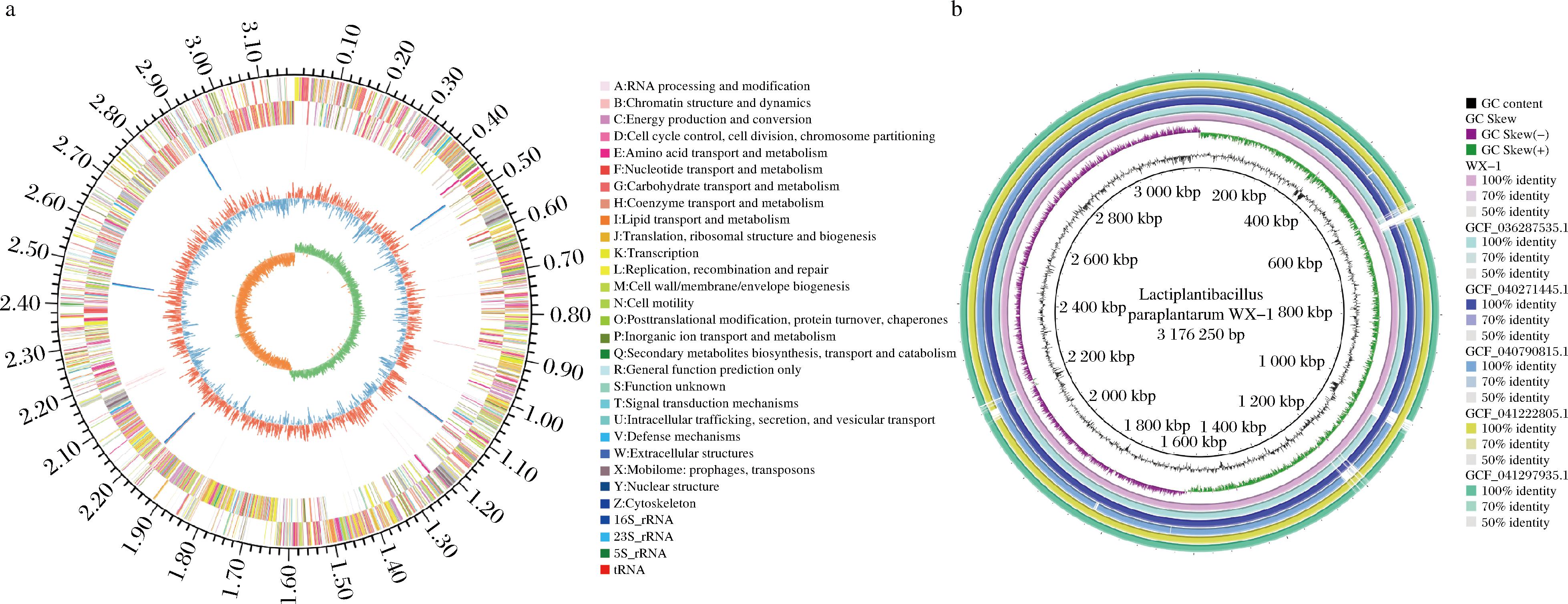 将2%(体积分数)的WX-1接种至MRS液体培养基中,37 ℃培养24 h后离心取菌体送至上海美吉生物科技有限公司进行全基因组测序。结合二代Illumina HiSeq和三代PacBio Sequel测序平台完成全基因组测序。对测序数据采取质控手段,去除adapter序列,剪切去除5’端含有非A、G、C、T的碱基,修剪测序质量较低的reads末端 (测序质量值 1.3.8 基因组功能注释与分析 利用Glimmer (http://ccb.jhu.edu/software/glimmer/index.shtml),GeneMarkS,Prodigal软件对基因组中的编码序列 (CDS) 进行预测。使用Prokka (version 1.12) 进行蛋白质编码基因的基因预测和计算注释,利用Swiss-Prot、Pfam、NR、COG、KEGG、GO等功能数据库对基因组序列进行功能注释。采用BAGEL4 (http://bagel4.molgenrug.nl) 和antiSMASH软件 (http://antiSMASH.secondarymetabolites.org/),鉴定了次级代谢物生物合成基因簇。 基于16S rDNA测序,选取部分乳酸菌标准菌株的16S rDNA序列,使用MEGA 11构建系统发育树。如图1-a所示,WX-1与植物乳植杆菌(Lactiplantibacillus plantarum) 的同源性最高,进一步确定该菌株为植物乳植杆菌。将WX-1的16S rDNA序列上传至NCBI数据库中,获取登录号PRJNA1202526。植物乳植杆菌WX-1保藏至菌种保藏中心,保藏号为CCTCC NO:M 20242501。植物乳植杆菌WX-1在MRS固态培养基上的菌落较小 (直径约1~2 mm),乳白色,表面光滑微凸起,边缘完整,呈规则圆形 (图1-b);革兰氏染色呈紫色,为革兰氏阳性菌,其细胞为短杆状,单个、成对或短链状 (图1-c)。 a-基于16S rRNA序列建立的系统发育树;b-菌落形态;c-显微形态图 图1 WX-1的鉴定及形态学观察 Fig.1 Identification and morphological observation of WX-1 2.2.1 酸和胆盐的体外耐受性 能否在人类胃肠道恶劣条件下生存是将菌株视为益生菌的一个先决条件。当植物乳植杆菌WX-1在pH为3的环境下进行培养,其活菌数随着培养时间的增加呈现逐渐降低的趋势,在0、2、4 h的活菌数分别为(7.10±0.8)×106、(6.60±0.42)×106、(4.33±0.25)×106 CFU/mL,当培养时间为4 h时菌株存活率仍可达到(61.29±3.48)%。 在不同胆盐浓度下,WX-1的活菌数随着时间的延长呈上升趋势 (表1)。通过酸和胆盐耐受评价,发现菌株WX-1具有较好的酸、胆盐耐受能力。 表1 植物乳植杆菌于不同胆盐浓度下的存活 Table 1 Survival of L.plantarum in different bile salt concentrations 牛胆盐质量浓度/ mg/mL 活菌数/ CFU/mL 0h2h4h3 8.25±0.21 ×106c 1.62±0.17 ×107b 1.05±0.032 ×108c6 9.75±0.49 ×106b 1.82±0.42 ×107b 1.17±0.21 ×108a9 6.62±0.68 ×106c 1.78±0.56 ×107b 1.25±0.02 ×108a12 5.85±0.07 ×106b 2.30±0.54 ×107b 1.33±0.27 ×108a 注:不同小写字母表示差异显著(P<0.05)。 2.2.2 植物乳植杆菌WX-1抑菌能力 对菌株WX-1的无细胞上清液的抑菌能力进行测定。经12 h培养的植物乳植杆菌WX-1上清液对金黄色葡萄球菌有较强的抑制作用,其抑菌圈直径达到(24.93±0.56) mm,抑菌率为(72.3±0.62)%。显著优于刘佳等[20]筛选的Bacillus subtilis 64-3对金黄色葡萄球菌的抑菌效果(最大抑菌圈直径为19.48 mm)以及植物乳植杆菌FCa3L与8PA3对金黄色葡萄球菌的抑菌效果,其最大抑菌圈直径为(7.20±0.45)、(1.75±0.95) mm[21]。 2.2.3 自聚集、共聚集 益生菌需要具备在宿主肠道内有效定植并能阻止病原菌在肠道定殖的能力。乳酸菌的自聚集是体外评估其黏附肠道细胞能力的一个重要指标菌株。根据自聚集率,可将菌株的自聚集能力分为弱(16%~35%)、中等(35%~50%)、强(高于50%)[22],菌株WX-1的自凝能力随时间的延长而增加,在1、5、8 h分别达到(12.40±6.23)%、(27.47±5.16)%、(44.29±4.47)%。显著高于檀茜倩等[23]筛选出的L.plantarum PC715的自聚集能力(27.64%),说明菌株WX-1具有较好的黏附特性。 益生乳酸菌可以通过与病原菌共凝聚来降低胃肠道内病原体的群体水平,从而达到阻止病原体侵染宿主的效果[24]。根据试验结果,菌株WX-1的共凝聚能力为(11.13±4.23)%。 2.3.1 溶血试验 溶血试验结果显示,菌株WX-1未表现出溶血性,具有体外安全性,与赵丽娜[25]等研究结果一致。 2.3.2 抗生素敏感性 虽然已经确定大多数属于乳酸杆菌属的微生物对抗生素敏感,但某些菌株也表现出一定程度的耐药性。研究表明,不同植物乳植杆菌菌株对抗生素的耐药性可能存在差异。结果显示,WX-1对卡那霉素、氨苄西林、头孢噻肟、红霉素、四环素、氯霉素、克林霉素以及青霉素呈现较高敏感性,对氨基糖苷类抗生素:卡那霉素、庆大霉素以及链霉素有耐药性(表2)。由于卡那霉素、庆大霉素以及链霉素能够抑制蛋白质合成,但革兰氏阳性菌细胞壁厚,使得其不能进入细胞壁干扰细胞膜合成,因此具有一定耐药性[26]。 表2 菌株对常用抗生素的敏感性 Table 2 Susceptibility of strains to common antibiotics 抗生素类别抗生素药物质量/μg抑菌圈直径判断标准/mmRIS敏感性β-内酰胺类氨苄西林10≤1314~16≥17S头孢噻肟30≤2223~25≥26S大环内脂类红霉素15≤1314~22≥23S氨基糖苷类卡那霉素30≤1314~17≥18n.r.庆大霉素10≤1213~14≥15n.r.链霉素10≤1112~14≥15n.r.四环素类四环素30≤1112~14≥15S氯霉素类氯霉素30≤1213~17≥18S林可胺类克林霉素2≤1415~20≥20S青霉素类青霉素10≤1314~17≥18S 注:n.r.表示不敏感 将植物乳植杆菌WX-1全基因组序列上传至NCBI获得登录号:PRJNA1202526。使用Circos v.0.64生成菌株WX-1的基因组图谱(图2-a),菌株WX-1基因组长度为3 241 479 bp,GC含量为44.58%,基因组包括3 052个编码序列(coding sequences,CDSs)、16个16rRNA、75个tRNA、38个sRNA,包含一个完整的染色体序列和1个完整的质粒序列。其中染色体序列大小为3 1