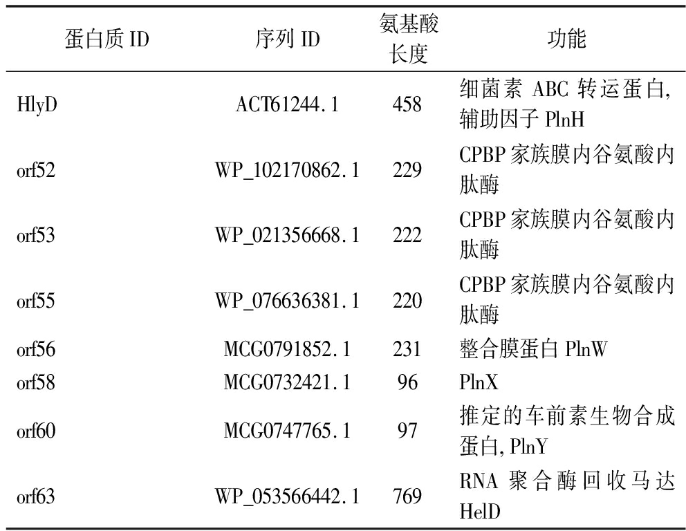 植物乳植杆菌是一种广泛分布于自然界中的有益菌,其具有优异的益生菌特性和安全性,常用于食品和益生菌生产。它可以从不同的糖中获取能量,并对乳制品、蔬菜、葡萄酒以及人类和动物的胃肠道等多种生态位具有很高的适应性。作为研究最广泛的益生菌乳酸菌之一,植物乳植杆菌已获得欧洲食品安全局(European Food Safety Authority,EFSA) 和美国食品药品监督管理局(Food and Drug Administration,USFDA) 的安全认证,确认其为一般公认安全(Generally Recognized as Safe,GRAS) 微生物[1]。植物乳植杆菌具有抗氧化、调节血脂异常[2]、改善肠道炎症和屏障功能[3-4]、调节肠道内稳态[5]、免疫调节和抗菌等益生菌特性,具有良好的健康促进作用。近年来,植物乳植杆菌的抑菌抗菌功能性研究逐渐受到重视,其产生的多种抗菌化合物,如有机酸、过氧化氢和细菌素[6-7],能够有效对抗多种致病菌[8-9]。特别是细菌素这种由核糖体合成并释放到细胞外空间的生物活性肽或蛋白质,具有高效杀菌或抑菌能力,同时还兼具无毒无害、无抗药性、不易残留和稳定性强的特点,已被用作食品生物防腐剂,鉴于其优异的抗菌活性,使之得以成为抗生素和化学防腐剂的理想替代品[10]。