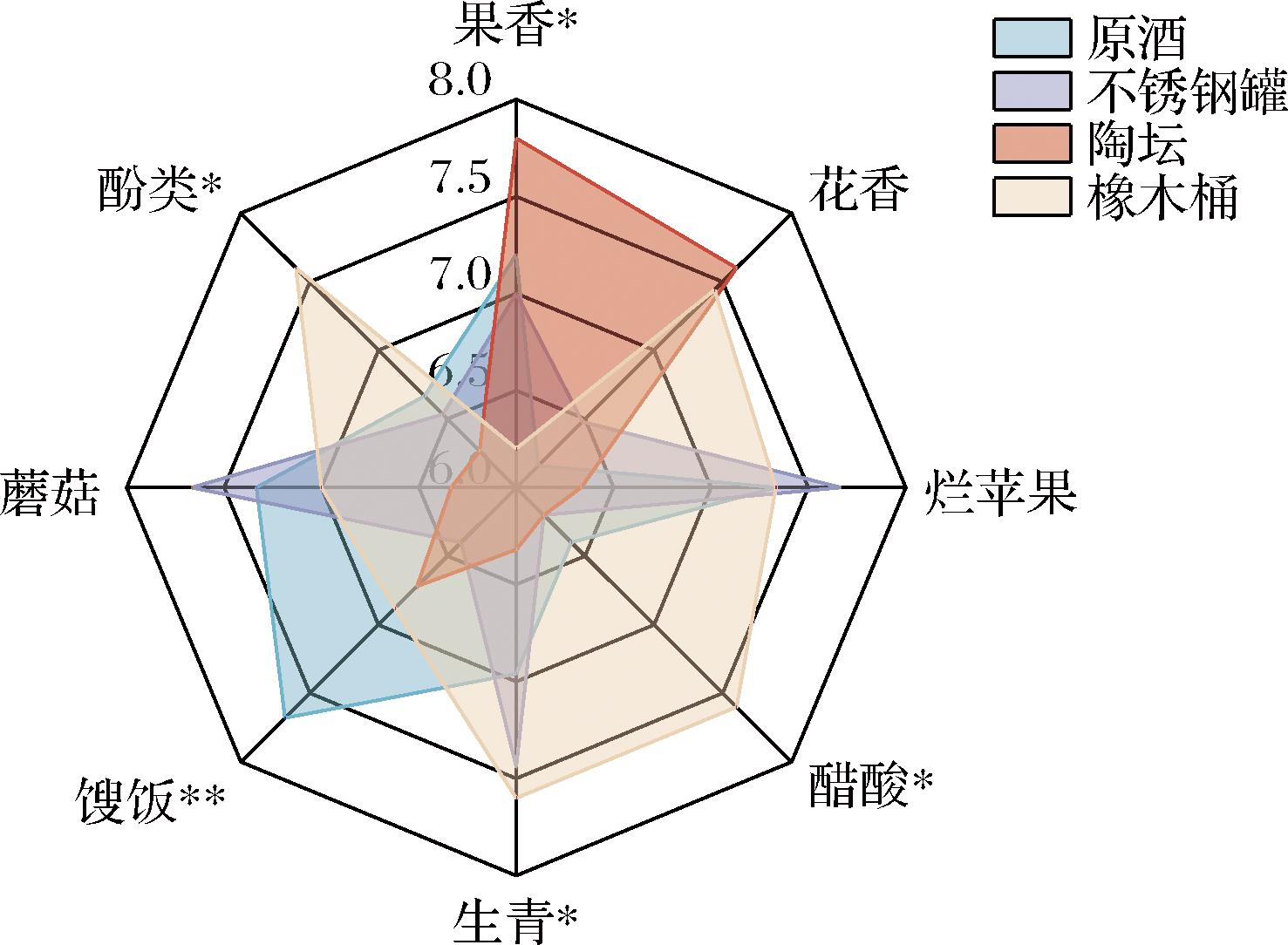 为验证不同容器陈酿对葡萄酒感官的影响,本研究通过感官评价小组对上述葡萄酒进行了描述性分析。结果如图2所示,经陶坛陈酿后的葡萄酒中醋酸、生青、酚类异嗅气味强度显著降低(P<0.05);馊饭气味强度极显著降低(P<0.01),这与先前定量检测结果一致。具有烂苹果气味的乙醛、蘑菇气味的1-辛烯-3-酮含量的降低并未使得葡萄酒出现对应感官上的显著变化。值得一提的是,陶坛陈酿后的葡萄酒的果香强度显著增加,这一结果似乎与陶坛材料对葡萄酒主要果香物质酯类同样存在吸附作用的事实不符[10]。事实上,陶材料容器陈酿后的葡萄酒果香更强已被孙文静等[11]证实。因此,陶坛陈酿后葡萄酒果香增强的现象可能与部分异嗅化合物的果香抑制作用减少有关。例如,4-EP和4-EG会抑制葡萄酒的果香[27-28],即便质量浓度低于其感知阈值。本研究中陶坛可能通过降低了4-EG的含量,从而降低了其对果香的抑制作用。