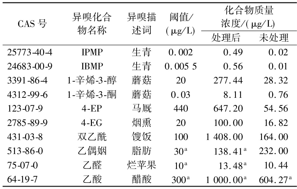 CAS号异嗅化合物名称异嗅描述词阈值/ μg/L 化合物质量浓度/ μg/L 处理后未处理25773-40-4IPMP生青0.002 0.49 0.0224683-00-9IBMP生青0.00550.560.013391-86-41-辛烯-3-醇蘑菇20277.4428.324312-99-61-辛烯-3-酮蘑菇0.038.110.76123-07-94-EP马厩440647.2054.562785-89-94-EG烟熏20100.0016.82431-03-8双乙酰馊饭1001408.00164.00513-86-0乙偶姻脂肪30a138.41a232.0075-07-0乙醛烂苹果10a13.48a10.4464-19-7乙酸醋酸300a1000.00a604.27a