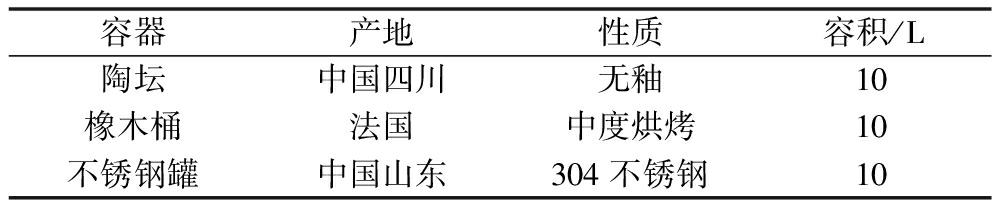 容器产地性质容积/L陶坛中国四川无釉10橡木桶法国中度烘烤10不锈钢罐中国山东304不锈钢10