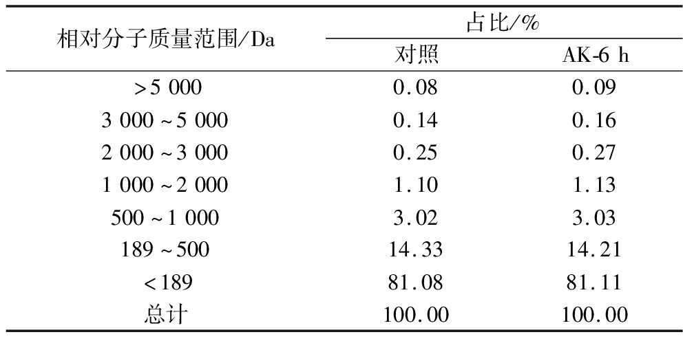 相对分子质量范围/Da占比/%对照AK-6h>50000.080.093000~50000.140.162000~30000.250.271000~20001.101.13500~10003.023.03189~50014.3314.21<18981.0881.11总计100.00100.00