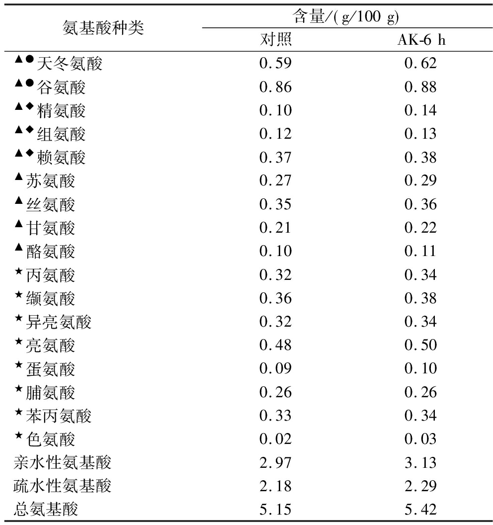 氨基酸种类含量/ g/100g 对照AK-6h▲●天冬氨酸0.590.62▲●谷氨酸0.860.88▲◆精氨酸0.100.14▲◆组氨酸0.120.13▲◆赖氨酸0.370.38▲苏氨酸0.270.29▲丝氨酸0.350.36▲甘氨酸0.210.22▲酪氨酸0.100.11★丙氨酸0.320.34★缬氨酸0.360.38★异亮氨酸0.320.34★亮氨酸0.480.50★蛋氨酸0.090.10★脯氨酸0.260.26★苯丙氨酸0.330.34★色氨酸0.020.03亲水性氨基酸2.973.13疏水性氨基酸2.182.29总氨基酸5.155.42