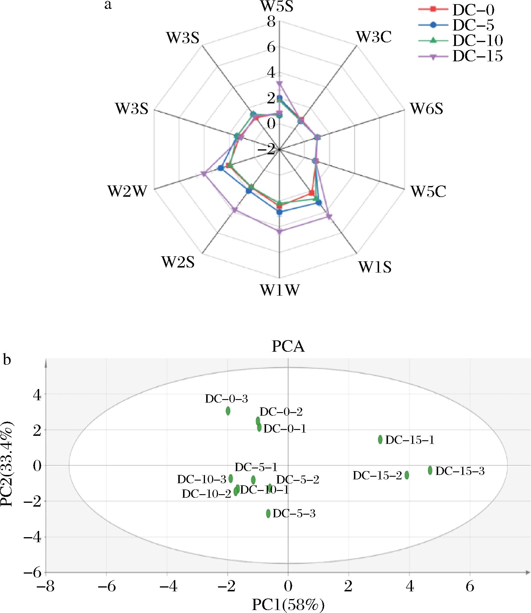 电子鼻作为一种常见的风味分析仪器,常用于检测食品中的挥发性物质。本研究采用了包含10个不同传感器的电子鼻阵列对发酵豆豉样品的挥发性风味物质组成进行了初步分析。由图3-a可知,不同发酵时间的豆豉样品对传感器W5S、W1S、W2S、W1W和W2W均表现出较高的响应值,且随着发酵时间的延长响应值逐渐增长,这表明豆豉经枯草芽孢杆菌T2发酵的过程中大量产生了氮氧化物、甲烷、醇类物质、醛酮类物质及硫化物,形成了豆豉独特的风味特征。随后,对电子鼻数据进行主成分分析(principal component analysis,PCA)以综合分析发酵豆豉各时间点挥发性风味物质组成的差异。如图3-b 所示,PC1和PC2的累积方差贡献率为 91.4%,表明它们能够有效反映不同样本的风味特征信息。DC-15组主要集中在x正半轴区域,而DC-0、DC-5和DC-10组主要集中在在x负半轴区域,说明DC-15组和其他组的挥发性风味物质组成存在显著差异。DC-5和DC-10组在第三象限,而DC-0组在第一象限,因此可以得出结论DC-5和DC-10组的挥发性风味物质组成最为相似。