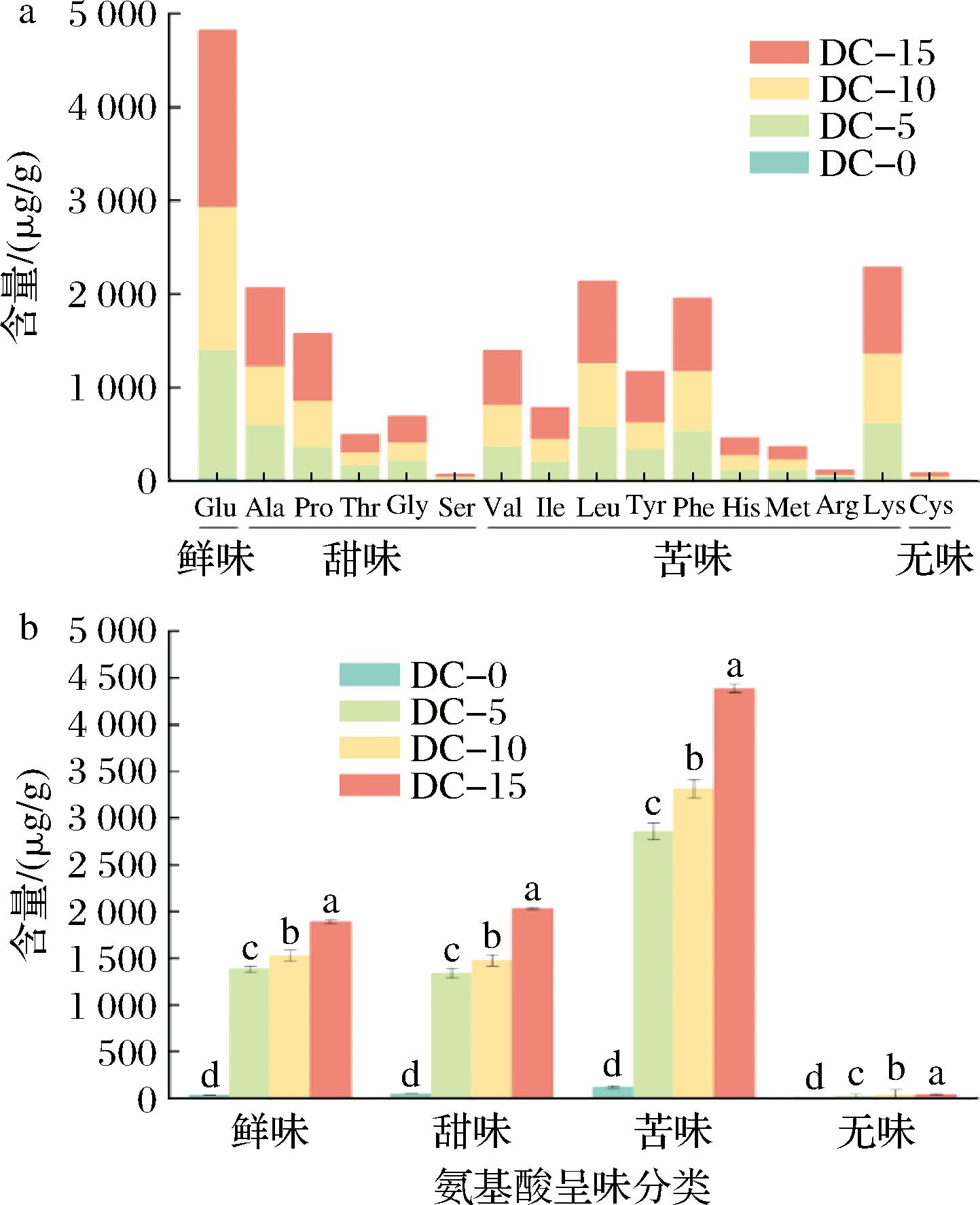 FAAs对发酵豆豉的风味特征至关重要,它们是微生物生长和代谢的主要氮源,部分蛋白质被枯草芽孢杆菌肽酶和蛋白酶水解形成肽和各种FAAs[16]。氨基酸经脱氨、脱羧等反应后,可形成酸类、醇类、酯类等风味物质[6],进而影响豆豉的风味特性。由图1可知,DC-5、DC-10和DC-15组的FAAs总含量均高于DC-0组,并随着发酵时间的延长,蛋白质不断降解成FAAs,其整体含量一直在逐渐增加。
