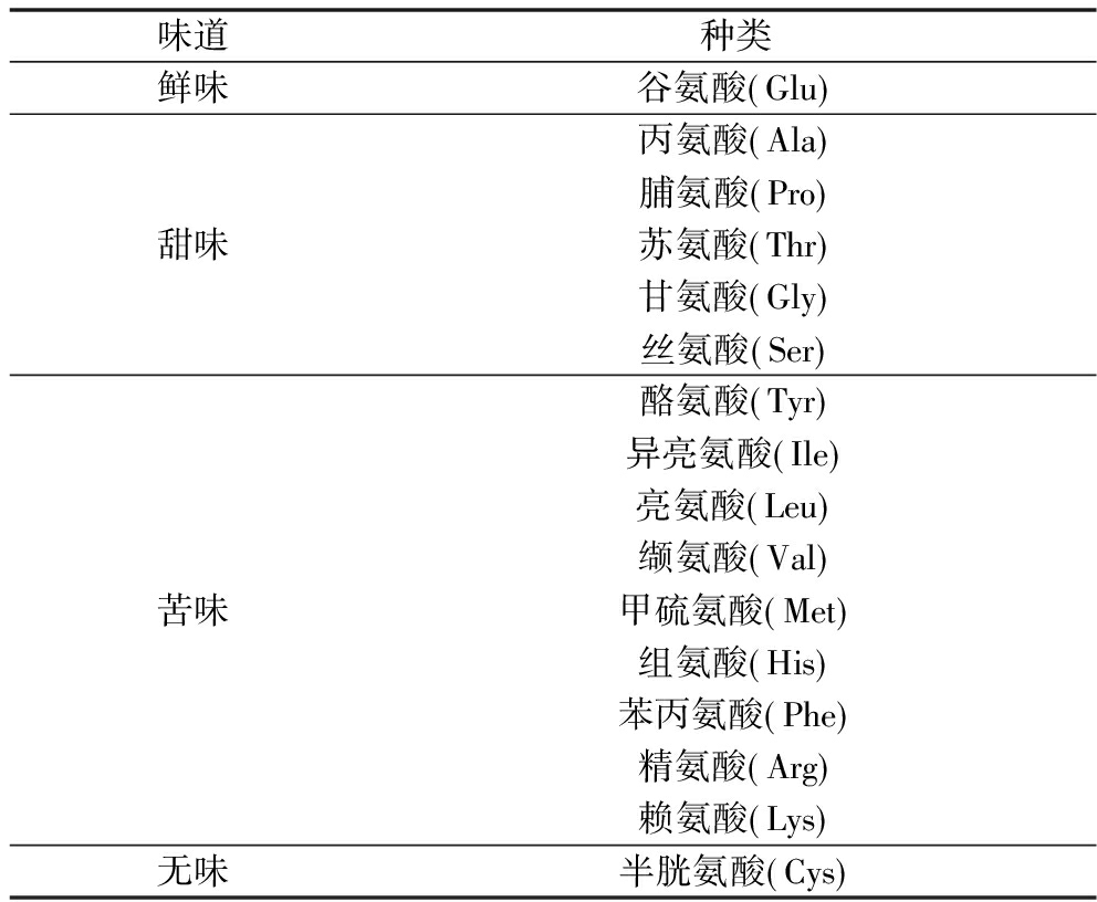 味道种类鲜味谷氨酸 Glu 甜味丙氨酸 Ala 脯氨酸 Pro 苏氨酸 Thr 甘氨酸 Gly 丝氨酸 Ser 苦味酪氨酸 Tyr 异亮氨酸 Ile 亮氨酸 Leu 缬氨酸 Val 甲硫氨酸 Met 组氨酸 His 苯丙氨酸 Phe 精氨酸 Arg 赖氨酸 Lys 无味半胱氨酸 Cys