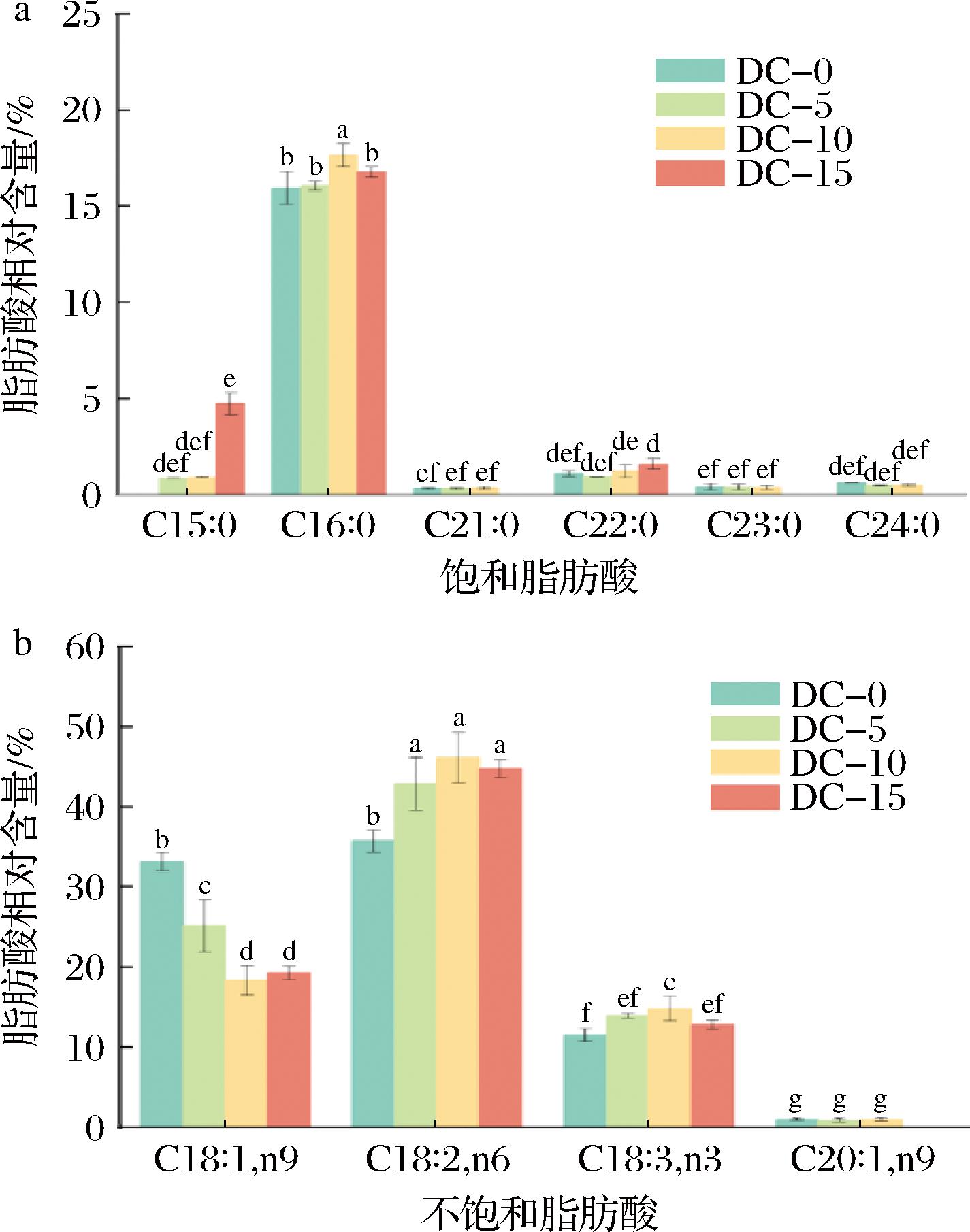 从SFA来看,C16∶0相对含量最高,DC-10组C16∶0的相对含量显著高于DC-0、DC-5和DC-15组。豆豉发酵后期C16∶0相对含量的下降可能是因为C16∶0被枯草芽孢杆菌T2产生的酶分解所造成的[19]。豆豉发酵过程中C15∶0的相对含量呈上升趋势,DC-15组的C15∶0相对含量显著高于DC-0组,可能是由于部分UFA转化为SFA导致其相对含量增加。DC-0和DC-5组的C22∶0相对含量在DC-15组有所增加。另外C21∶0、C23∶0和C24∶0这些较长的SFA含量在DC-0到DC-10均保持在较低水平,说明豆豉发酵对这些SFA的产生影响较小。