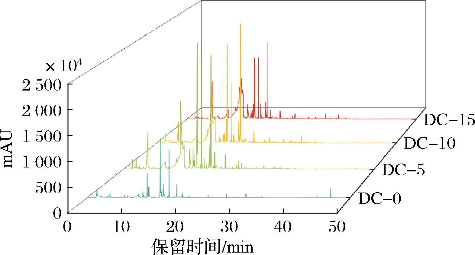 将500 g优质饱满的黄豆清洗后在1 000 mL蒸馏水中浸泡12 h,直到黄豆表皮无皱纹,121 ℃蒸煮20 min,然后冷却至室温。以3%(体积分数)的接种量接种至冷却的黄豆基质,摇匀后在37 ℃静置发酵,每隔6 h摇匀,防止发酵基质核心温度过高。分别在0、5、10、15 d收集样品,分别标记为DC-0、DC-5、DC-10和DC-15,将样品储藏在-20 ℃以供后续分析。
