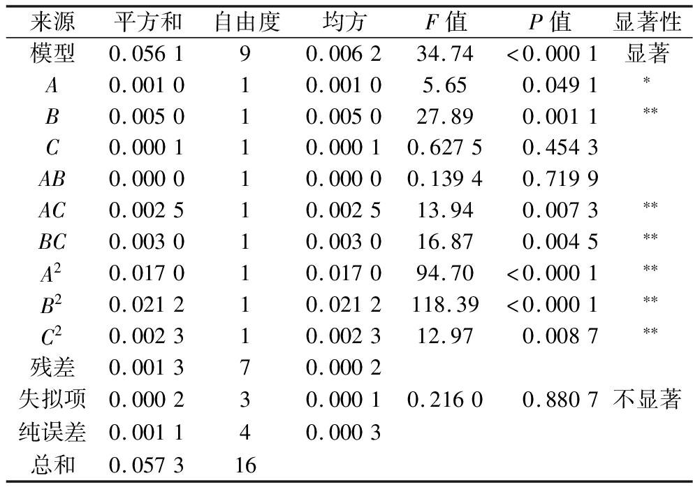 来源平方和自由度均方F值P值显著性模型0.056190.006234.74<0.0001显著A0.001010.00105.650.0491∗B0.005010.005027.890.0011∗∗C0.000110.00010.62750.4543AB0.000010.00000.13940.7199AC0.002510.002513.940.0073∗∗BC0.003010.003016.870.0045∗∗A20.017010.017094.70<0.0001∗∗B20.021210.0212118.39<0.0001∗∗C20.002310.002312.970.0087∗∗残差0.001370.0002失拟项0.000230.00010.21600.8807不显著纯误差0.001140.0003总和0.057316