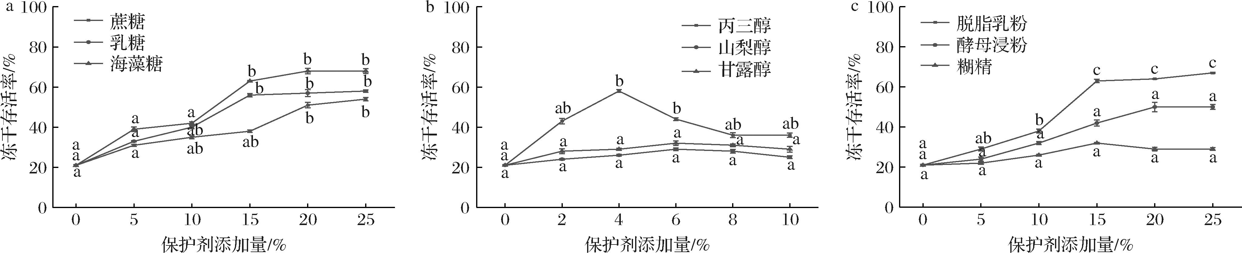 探究糖类、多元醇类、混合物类冻干保护剂添加量对复合乳酸菌冻干存活率的影响。糖类保护剂种类和添加量(质量分数,下同):蔗糖、乳糖、海藻糖(0%、5%、10%、15%、20%、25%);多元醇类保护剂种类和添加量:丙三醇、山梨醇、甘露醇(0%、2%、4%、6%、8%、10%)、混合物类保护剂种类和添加量:脱脂乳粉、酵母菌粉、糊精(0%、5%、10%、15%、20%、25%)。