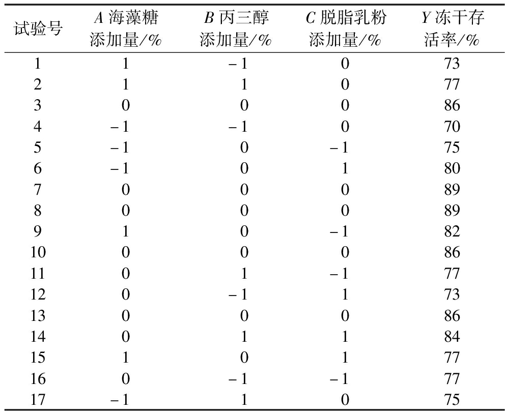 运用Box-Behnken中心组合试验设计原理,选择海藻糖、丙三醇和脱脂乳粉3个因素,以冻干存活率为响应值,设计三因素三水平响应面分析试验优化复合乳酸菌冻干保护剂的组合配比。各因素水平编码如表1所示。