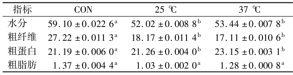 指标CON25℃37℃水分59.10±0.0226a52.02±0.0088b53.44±0.0078b粗纤维27.22±0.0113a18.17±0.0114b17.11±0.0106b粗蛋白21.19±0.0060a21.26±0.0040b23.15±0.0031b粗脂肪1.37±0.0044a1.03±0.0020a1.28±0.0008a