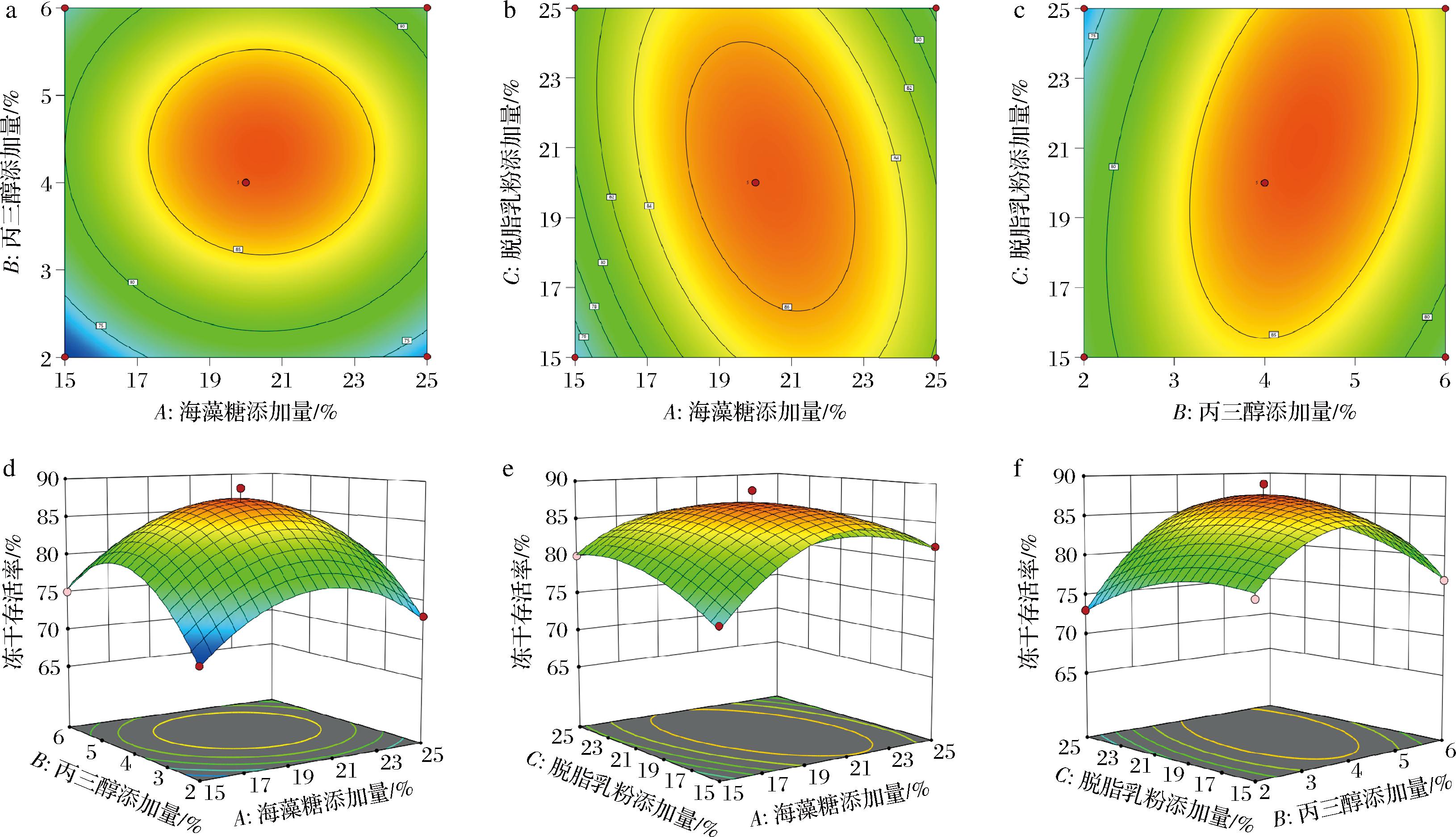 a-海藻糖-丙三醇添加量对冻干存活率的等高线图;b-海藻糖-脱脂乳粉添加量对冻干存活率的等高线图;c-丙三醇-脱脂乳粉添加量对冻干存活率的等高线图;d-海藻糖-丙三醇添加量对冻干存活率的响应面图;e-海藻糖-脱脂乳粉添加量对冻干存活率的响应面图;f-丙三醇-脱脂乳粉添加量对冻干存活率的响应面图