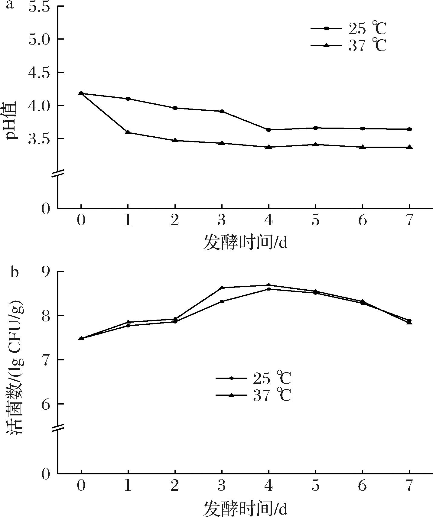 发酵过程中每24 h取样,每次取5 g发酵样品于45 mL无菌水中混匀,静置30 min后取上清液,用pH计测定0~7 d发酵产物的pH值。同时对发酵样品进行梯度稀释,选取合适的稀释梯度在MRS固体培养基上平板涂布37 ℃静置培养48 h,记录乳酸菌的活菌数。