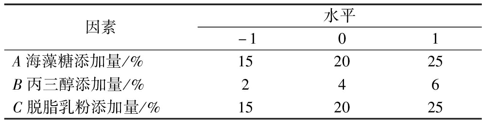 因素水平-101A海藻糖添加量/%152025B丙三醇添加量/%246C脱脂乳粉添加量/%152025