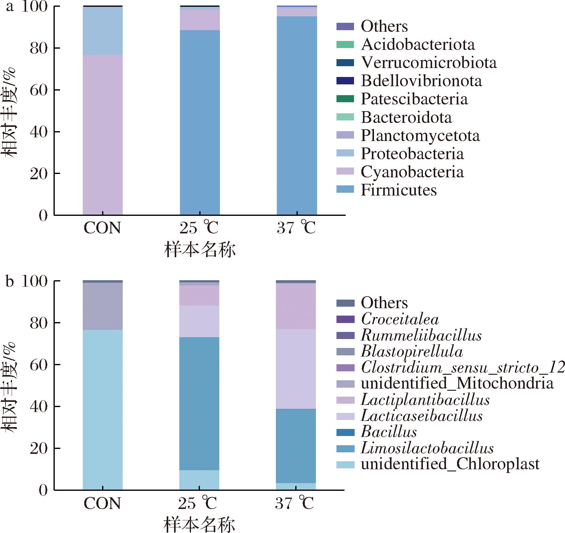 不同温度下发酵第4天样品与未发酵的样品在门水平和属水平上分析前十细菌群落结构分布,结果表明发酵样品中各菌属的丰度发生了明显变化。如图6所示,在门水平上,未发酵(CON)组中优势菌群为蓝藻门(Cyanobacteria)和变形菌门(Proteobacteria),相对丰度分别为76%和23%。25 ℃和37 ℃发酵组中,优势菌群演变为厚壁菌门(Firmicutes),相对丰度分别为89%和95%,显著高于CON组(0.12%);同时抑制了蓝藻门(Cyanobacteria)和变形菌门(Proteobacteria)的增殖。在属水平上,与CON组相比,25 ℃发酵组中粘液乳杆菌属(Limosilactobacillus,丰度为64%)、乳酪杆菌属(Lacticaseibacillus,15%)、乳植杆菌属(Lactiplantibacillus,10%)的丰度显著升高,粘液乳杆菌增殖为优势菌群;37 ℃发酵组中粘液乳杆菌属(Limosilactobacillus,35%)、乳酪杆菌属(Lacticaseibacillus,38%)、乳植杆菌属(Lactiplantibacillus,22%)的丰度显著升高,乳酪乳杆菌属和粘液乳杆菌属为优势菌群。这一结果表明乳酸由于自身代谢特性的差异,根据发酵温度对底物中营养物质进行竞争和高效利用,实现快速增殖并占据优势地位,同时抑制蓝藻门和变形菌门的生长[18]。这种抑制作用不仅减少了潜在致病菌和腐败菌的滋生,还提高发酵苹果渣的品质[19]。