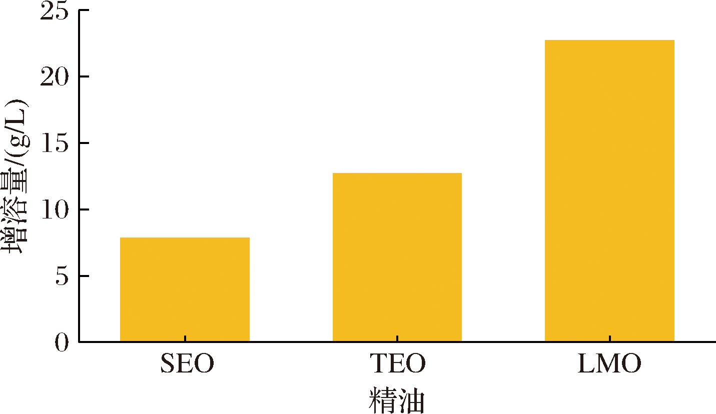 柑橘精油在质量分数为5%吐温-80胶束溶液中的最大增溶量使用紫外可见分光光度计来测量[16]。将3种精油分散在吐温-80溶液中,以空白的吐温-80溶液调零,在紫外分光光度计中测量3种精油的吸光度,并制备相应标准曲线。室温下,将过量的精油加入质量分数为5%的吐温-80水溶液中,平衡3 d,然后取下层水相,测定吸光度进行定量,计算出3种精油在质量分数为5%的吐温-80水溶液的最大增溶量。