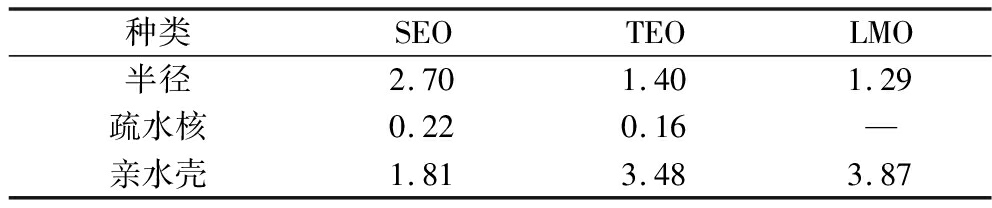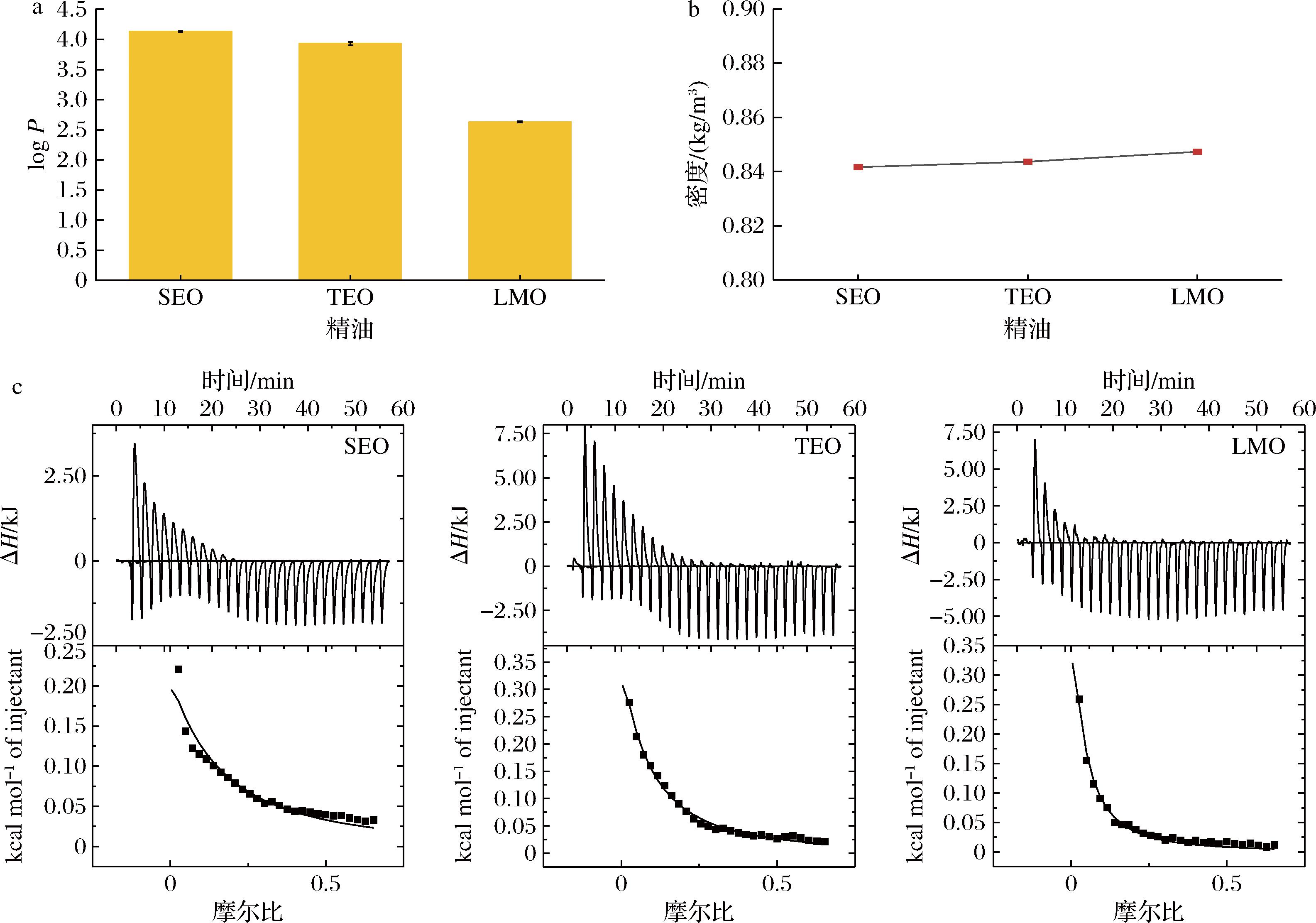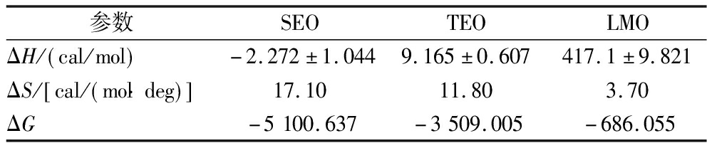 在室温25 ℃的条件下测定了3种复合柑橘精油的最大增溶量,如图1所示。将相同质量的3种复合精油分别添加到含有质量分数为10%吐温-80的水溶液中,静置24 h。除去表面漂浮的精油,利用紫外分光光度计测量吐温-80水溶液中精油的最大增溶量。结果显示,SEO的最大增溶量为7.5 g/L,TEO的最大增溶量12.8 g/L,LMO的最大增溶量为23.1 g/L。3种复合精油的最大增溶量的顺序为:SEO 图1 三种复合精油的最大增溶量 Fig.1 Maximum solubilization of three compound essential oils 使用GC-MS技术对3种精油的挥发性成分进行分析,如图2-a所示。通过将复合精油分离成单个组分来确定分离成分的含量和化学组成,并与观察到的增溶行为相关联。GC-MS结果表明,3种复合精油中都大约存在40种物质,主要成分为D-柠檬烯、β-月桂烯、γ-松油烃、柠檬醛和芳樟醇等,与BORA等[18]的研究结果一致。柑橘精油是一种非常复杂的混合物,其90%~95%都为可挥发性化合物(单萜和倍半萜烃及其氧化衍生物以及脂族醛、醇酯),按照官能团可将其分成萜烯烃、酯、醇和醛。烃类物质是柑橘精油的主要组成化合物,SEO的烃类物质含量为96.41%,TEO为95.36%,LMO为85.76%。D-柠檬烯是3种精油中含量最多的萜烯烃,SEO的含量为89.92%,TEO的含量为86.83%,LMO的含量为78.29%。AKAMATSU等[19]发现,D-柠檬烯增溶在胶束的疏水核心。SEO中含有少量的醇、醛、酯,含量分别为1.14%、1.31%、0.74%,总量为3.19%,是3种复合精油中含氧化合物含量最少的。TEO中含有2.3%的醇,醛和酯的含量分别为1.33%和0.29%,总量为3.92%。LMO中含有12.25%的醛类物质,其中柠檬醛占精油组成的9.94%。LMO中还含有0.9%的醇类物质,几乎不含有酯类物质,总量为13.15%。3种精油化合物组成不同导致其水溶解度各不相同,精油中的主要物质D-柠檬烯,难溶于水,而醛、酯以及醇等这类化合物微溶于水。根据图2-b可得3种精油的水溶解度的顺序为:SEO a-化合物组成;b-水溶解度 图2 三种复合精油的化合物组成和水溶解度 Fig.2 Compound composition and water solubility of three compound essential oils 辛醇-水分配系数(log P)是一个广泛使用的热力学参数,用于衡量被增溶溶质疏水性的量度,log P不同,精油在胶束中增溶的位置也不同。如图3-a所示3种柑橘精油中SEO的疏水性最强,其次是TEO,最后是LMO;3种精油密度大小与精油中含氧基团的含量成正相关的关系,如图3-b所示SEO 表1 三种复合精油与吐温-80互作的热力学参数 Table 1 Thermodynamic parameters of interaction between three compound essential oils and Tween-80 参数SEOTEOLMOΔH/ cal/mol -2.272±1.0449.165±0.607417.1±9.821ΔS/ cal/ mol deg 17.1011.803.70ΔG-5100.637-3509.005-686.055 a-log P;b-密度;c-精油与吐温-80互作的ITC图谱 图3 三种复合精油的log P、密度以及精油与吐温-80互作的ITC图谱 Fig.3 The log P,density,and ITC map of essential oils interacting with Tween-80 of three compound essential oils 对3种精油的油水界面张力进行测量,如图4-a所示,精油油水界面张力的大小顺序:SEO>TEO>LMO。因为SEO疏水性强,所以油水界面张力最大;TEO及LMO中含有醇酯醛等两亲物质,可定位在界面减小界面张力。复合柑橘精油的log P与油水界面张力成正比。吐温-80的临界胶束质量浓度为1.4 mg/L。当增溶复合精油时,吐温-80的含量要达到其CMC,才可起增溶作用,因此测定了溶液中含有质量分数为1%(下同)三种不同种类精油时吐温-80的CMC,依次如图4-b~图4-d所示。当在不同浓度的吐温-80溶液中加入1%的精油之后,溶液中疏水面积增加,3种精油的吐温-80的临界胶束浓度增加。3种精油中,含SEO的吐温-80 CMC最高,为2.4 mg/L;含TEO的CMC较含SEO的低,为2.2 mg/L。而含LMO的CMC最低,为2.0 mg/L。吐温-80的CMC与油水界面张力有关。当油水界面张力低时,油更容易在界面处结合,表面活性剂临界胶束浓度降低。吐温-80的CMC也受化合物增溶位置的影响。EDRIS发现萜烯类增溶在胶束核心,引起胶束核心膨胀,聚集数增大[21]。SEO中大部分化合物都增溶在胶束核心,因此胶束聚集数大,临界胶束浓度高。精油中的两亲化合物如萜烯醇等可以增溶在胶束栅栏处,因此TEO和LMO胶束聚集数小,临界胶束浓度低。LMO的log P为2.63,其胶束核心的体积需求量最少;LMO中醛类物质的含量为12.25%,FAN等[12]认为,log P范围为2~3.5的能增加体系中胶束的数量,因此LMO的CMC最低。 a-油水界面张力;b-含有SEO的临界胶束浓度;c-含有TEO的临界胶束浓度;d-含有LMO的临界胶束浓度 图4 三种复合精油的界面特性 Fig.4 Interface characteristics of three compound essential oils 将质量分数为1%的3种复合精油增溶到质量分数为10%的吐温-80胶束后,通过SAXS得到的散射强度如图5所示。当SEO和TEO增溶在吐温-80胶束中时,仅散射强度略有增加,表明精油进入胶束内核使其溶胀。当加入LMO时,散射峰变向低q区偏移,此现象表明聚集体之间的相互作用减小,有更大的聚集体形成。同时将归一化后的数据用Sas View软件的模型拟合,图5显示了X射线散射强度I(q)和GIFT拟合(实线),可以看出,SEO和TEO的胶束与圆球模型拟合良好,LMO的胶束与椭球模型拟合良好,说明SEO和TEO胶束为球形,LMO胶束为椭球形。当精油中的两亲性分子的极性基团优先位于胶束表面时促进了较低平均表面曲率的聚集体(棒状、盘状)的形成[22]。因为LMO中有较多的醛类物质增溶在胶束的栅栏处,降低了胶束的曲率,界面膜柔韧性变高,使胶束呈现椭球形。而SEO和TEO大多数香料分子增溶在胶束核心,胶束的曲率变化不大,呈球形。 a-SEO胶束的模型拟