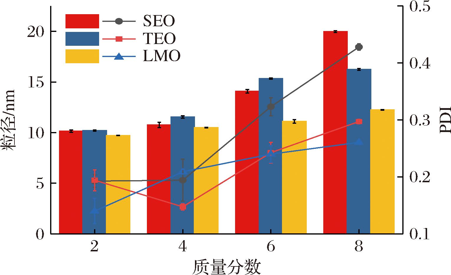 微乳液的粒度通常在2~50 nm的范围内,具有良好的透明度,因此被广泛应用在药物、化妆品和石油回收等领域[9]。微乳香精中存在大量的油水界面,一般需要20%~50%的食品级非离子表面活性剂来稳定,而大量的表面活性剂不仅生产成本高且不利于绿色生产,因此降低表面活性剂的用量及提高微乳增溶量成为了人们的研究重点。