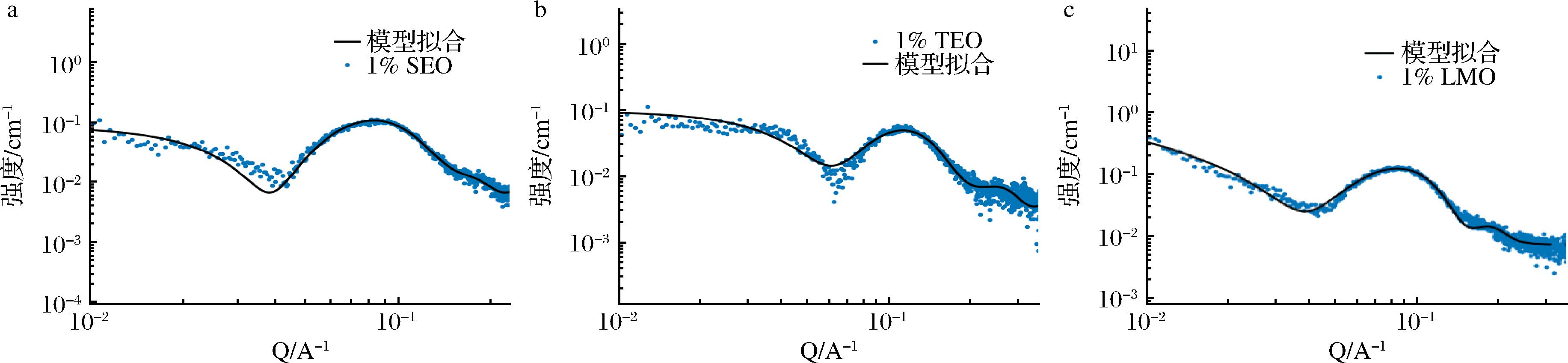 通过SAXS研究了负载质量分数为1%精油的微乳样品。使用SAXS point 2.0进行实验,探测器为Eiger 1M。对溶剂的背景散射进行校正,使用SAXS analysis软件分析散射图案并归一化数据。通过Sas View软件进行圆球和椭球模型拟合,得到微乳粒子相关半径[17]。