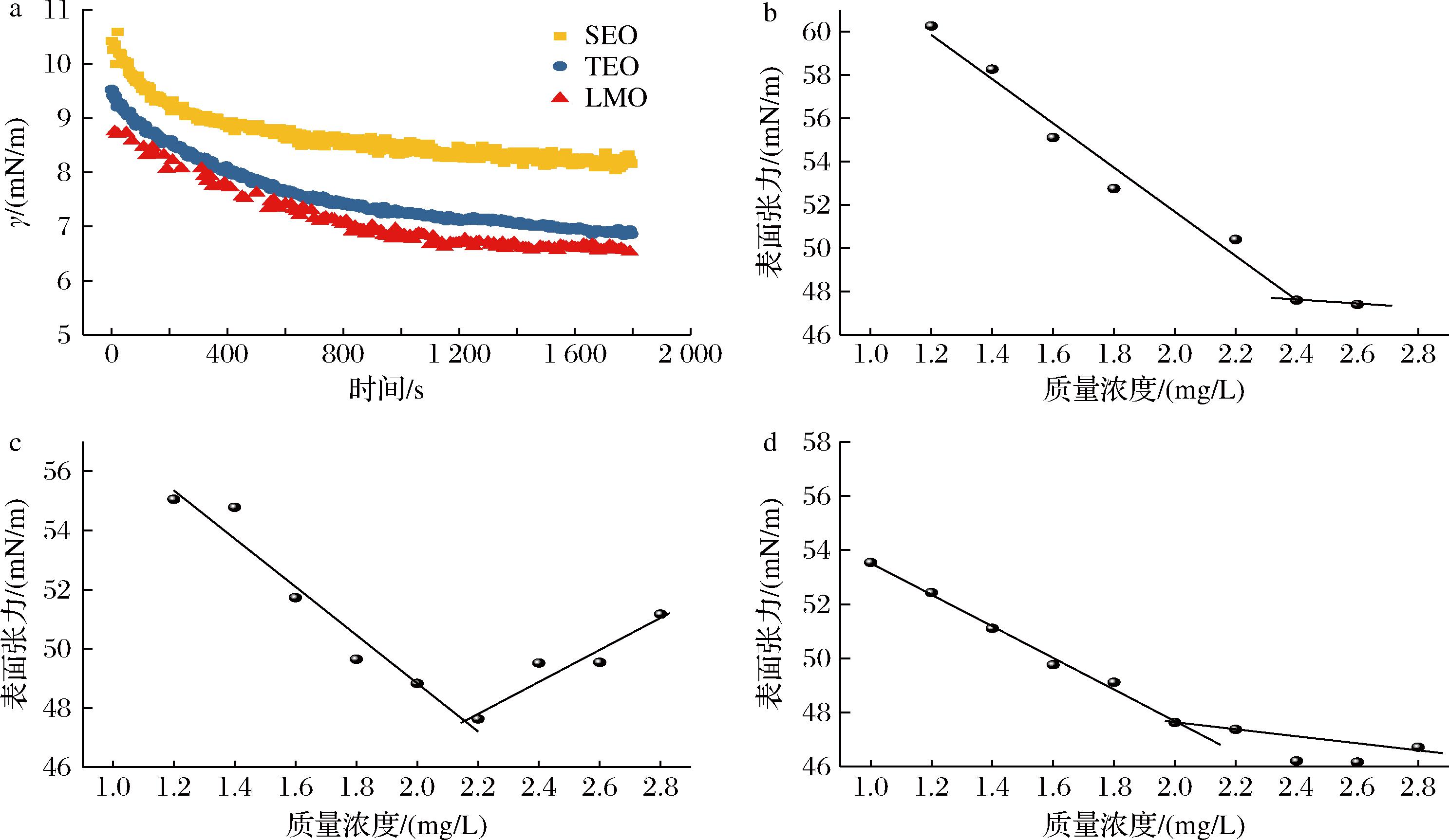 在室温25 ℃下,使用密度计测定所有液体的密度值;使用接触角张力仪测量精油的油水界面张力,取稳定1 h后的值为油水界面张力;辛醇-水分配系数的测定:溶剂的预饱和;将正辛醇和水在振荡器上混合,24 h后静置分层,分出被正辛醇饱和的水和被水饱和的正辛醇,备用。试样的处理;分别称取约1 g精油置于250 mL具塞锥形瓶中,加入一定体积经水饱和的正辛醇充分溶解后,选择正辛醇与水的1∶1体积比进行精油的分配系数试验,每组设置2个平行。将上述试样的锥形瓶置于已恒温至25 ℃的摇床中振荡24 h,使精油在两相中充分溶解并达到平衡后转入分液漏斗中静置分层,分离两相,采用紫外分光光度计的定量法测定水相中精油的浓度。通过接触角张力仪测量了吐温-80的临界胶束浓度(critical micelle concentration,CMC)。在不同浓度的吐温-80溶液中分别加入质量分数为1%的精油,并对吐温-80的CMC进行测定。