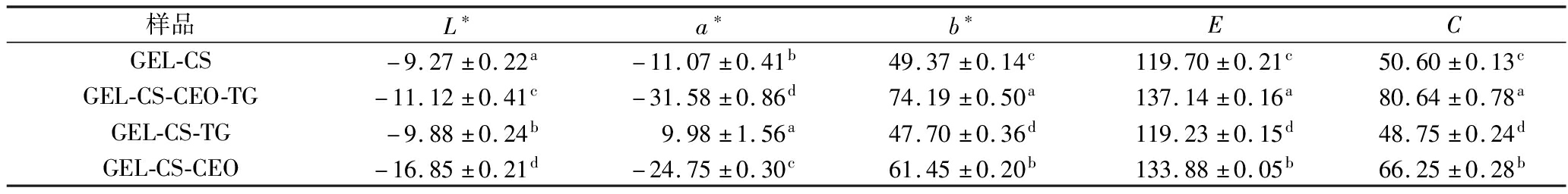 样品L∗a∗b∗ECGEL-CS-9.27±0.22a-11.07±0.41b49.37±0.14c119.70±0.21c50.60±0.13cGEL-CS-CEO-TG-11.12±0.41c-31.58±0.86d74.19±0.50a137.14±0.16a80.64±0.78aGEL-CS-TG-9.88±0.24b9.98±1.56a47.70±0.36d119.23±0.15d48.75±0.24dGEL-CS-CEO-16.85±0.21d-24.75±0.30c61.45±0.20b133.88±0.05b66.25±0.28b