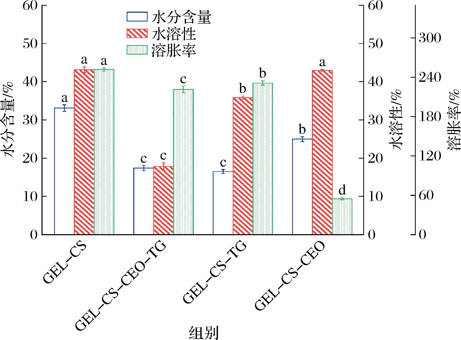 可食用膜的水敏感性与可食用膜厚度、亲水基团数量、膜内部结构和膜间的甘油含量有关[23]。如图4所示,与GEL-CS膜相比,GEL-CS-TG膜、GEL-CS-CEO膜、GEL-CS-CEO-TG膜的水分含量、水溶性和溶胀率均显著降低(P<0.05),这可能是因为TG改变了水分子与基质之间的结合机制,羟基分子与水分子间的连接减少,也可能是TG提高膜基质交联度,使膜水溶性降低,从而增加了可食用膜的耐水性[22]。此外,CEO含有疏水基团,影响可食用膜基质亲水性基团与水分子的相互作用[24]。