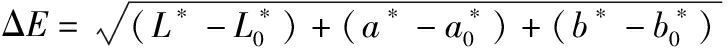 参考ZOLFAGHARI等[10]的方法并稍作修改。由分光色度计测量可食用膜的L*(亮度)、a*(正红色-负绿色)和b*(正黄色-负蓝色)。色差值(ΔE)和色度(C)根据以公式(4)和公式(5)计算。