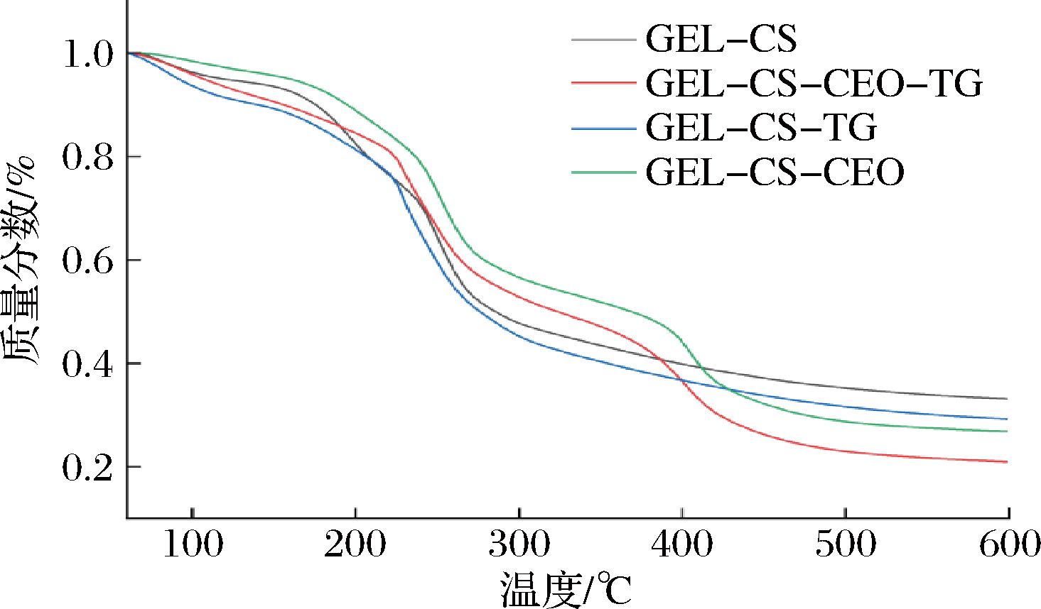 各种膜热重分析如图7所示。膜的热分解可以分为3个阶段。在第1个阶段中主要是由于膜中残留水分挥发而引起的重量损失,这与水蒸气透过量的表现一致。第2个阶段是膜中甘油逐步分解导致重量降低[28]。第3个阶段与膜分子间作用力或分子之间氢键的破坏有关,温度升高打破薄膜稳定结构导致重量降低。此外,不同膜之间的质量损失没有较大差异,且随着温度的升高,重量保留率趋于稳定。值得注意的是,GEL-CS膜的质量保留率略高于其他3种膜。因此,CEO和TG对GEL-CS膜基质的热稳定性影响较小。