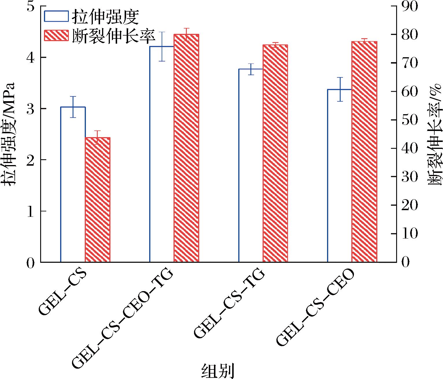 如图1所示,与GEL-CS膜相比,GEL-CS-TG、GEL-CS-CEO膜的机械强度有所提高。GEL-CS-CEO-TG膜的机械强度达到最大,TS为(4.21±0.29) MPa,EB为(80±2.22) %。这可能是因为在TG的催化下,GEL与CS的交联程度提高[16]。此外,CEO中的酚羟基可以与GEL中的羰基形成氢键或共价键,与CS中的羟基或氨基产生氢键作用,形成更为致密的三维网络结构,从而提高膜的TS和EB[17]。