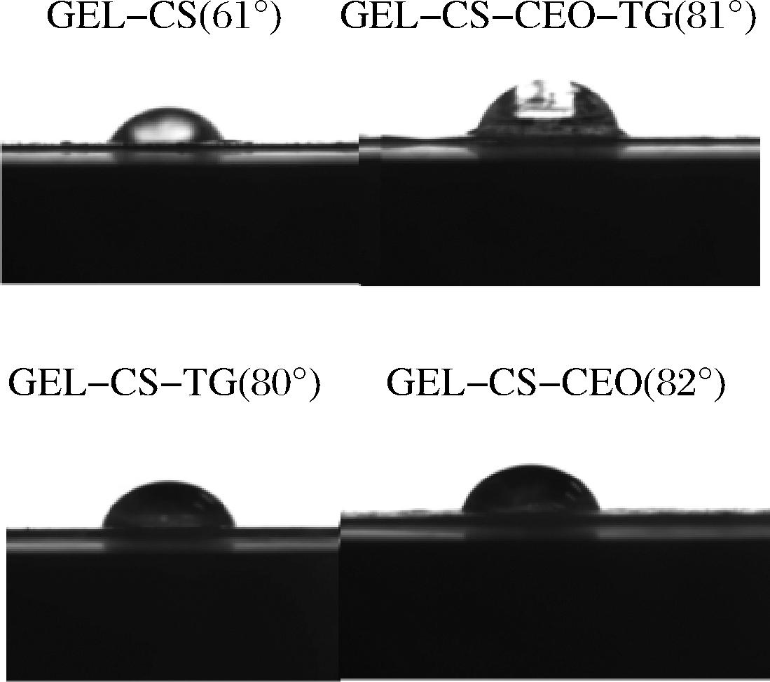 接触角与可食用膜表面润湿性有关,接触角>65°表示膜表面为疏水性,而接触角<65°表示膜表面为亲水性[21]。由图3可知,GEL-CS膜的水接触角为61°,表面为亲水性。GEL-CS-TG、GEL-CS-CEO和GEL-CS-CEO-TG膜的水接触角分别为80°、82°和81°,表明GEL-CS-TG、GEL-CS-CEO-TG和GEL-CS-CEO膜均为疏水表面,这可能是因为CEO具备疏水特性,引发了膜内部水分比例的减少,进而减缓了膜中水分含量的下降,也可能是因为在TG的催化下,GEL的结构打开,疏水基团暴露并交联[22]。