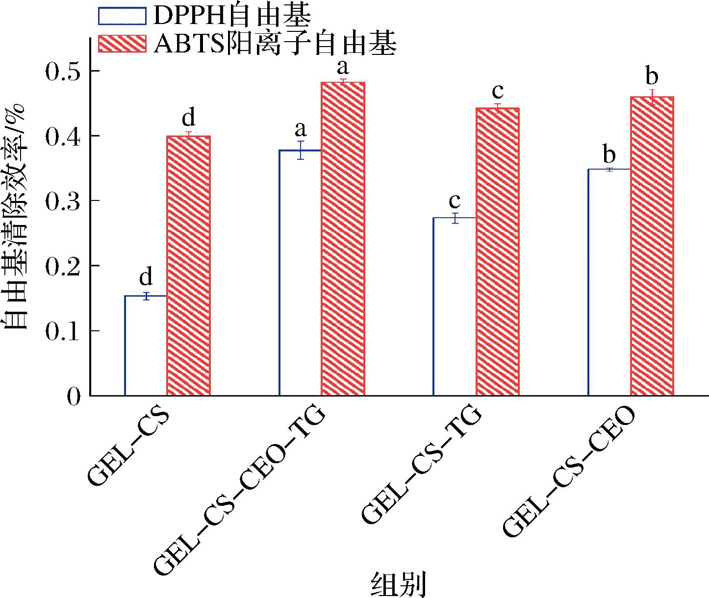 抗氧化能力是评定包装材料性能的一个重要指标,常通过DPPH自由基和ABTS阳离子自由基的清除能力评估。如图8所示,GEL-CS组表现出一定的清除自由基能力,这可能是因为CS中固有的游离氨基具备清除自由基的能力[4]。当添加TG后,GEL-CS-TG膜的DPPH自由基和ABTS阳离子自由基清除能力均有所增加(P<0.05),这可能是因为TG促进可食用膜三维网络形成,赋予可食用膜更优的抗氧化性能。此外,与GEL-CS相比,GEL-CS-CEO-TG膜的DPPH自由基清除率提高了146%,ABTS阳离子自由基清除率提高了23%。这可能是因为CEO中的酚羟基具有较强的供氢能力,与膜网络中的碳氢分子形成稳定的氢键[17],也可能是因为CEO在膜中释放活性物质,赋予可食用膜抗氧化性能。