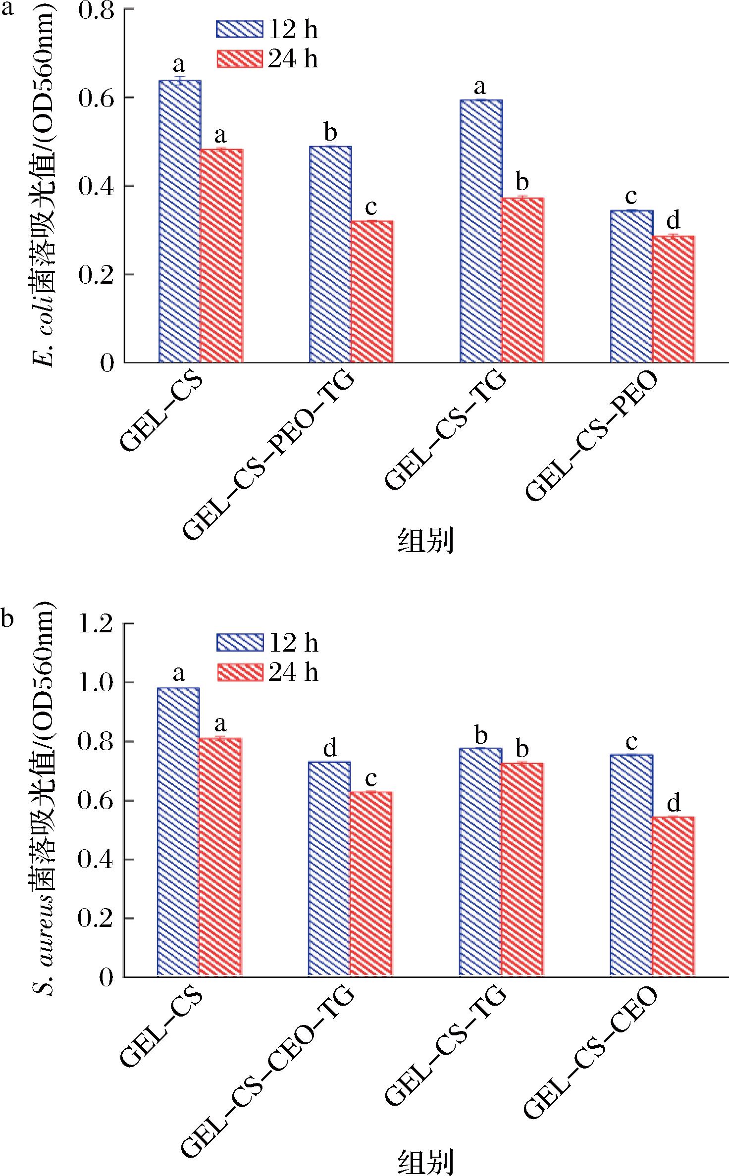 图10 可食用膜在12 h和24 h条件下大肠杆菌和金黄色葡萄球菌的比浊吸光值