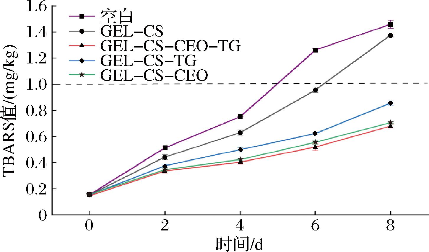 硫代巴比妥酸(thiobarbituric acid reactive substances,TBARS)值反映了含脂食品中脂质过氧化的程度,一般认为鱼肉中的TBARS值超过1 mg/kg不可接受。如图11所示,由于黑鱼不饱和脂肪酸含量高易氧化,贮藏前4 d,鱼肉TBARS值增长趋势平缓,之后空白组鱼肉TBARS迅速增加,在第4天后达到阈值(1 mg/kg)。而GEL-CS组在6 d时接近阈值,GEL-CS-TG组和GEL-CS-CEO组在第8天仍未达到阈值,说明CEO和TG的添加可以增强了膜的性能,这可能与CEO本身所具有的抗氧化活性物质有关[6],也可能是因为在TG的作用下,可食用膜交联度增加,内部结构紧密,具有更高的阻隔性能,从而表现出更好的降低脂质氧化的效果。特别是GEL-CS-CEO-TG膜,可以延缓黑鱼鱼肉脂质氧化4~5 d,具有良好的保鲜效果。