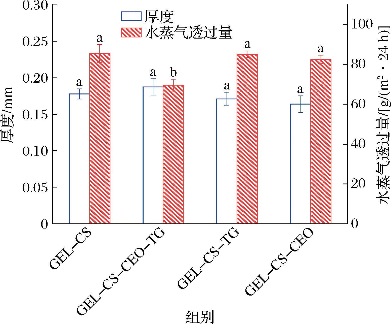 膜水蒸气透过量与厚度有关,是膜物理性质的重要指标。如图2所示,GEL-CS-TG膜和GEL-CS-CEO膜的厚度与水蒸气透过量均未发生显著变化。GEL-CS-CEO-TG膜的厚度变化不显著,但是水蒸气透过量显著降低(P<0.05),这可能是由于同时添加TG和CEO,增强了膜中的共价键相互作用以及分子之间的网络交联,网络结构更加紧密,抑制了水分的渗透[17]。此外,CEO形成的疏水层降低水分的移动速率,有利于阻隔水分迁移[18]。