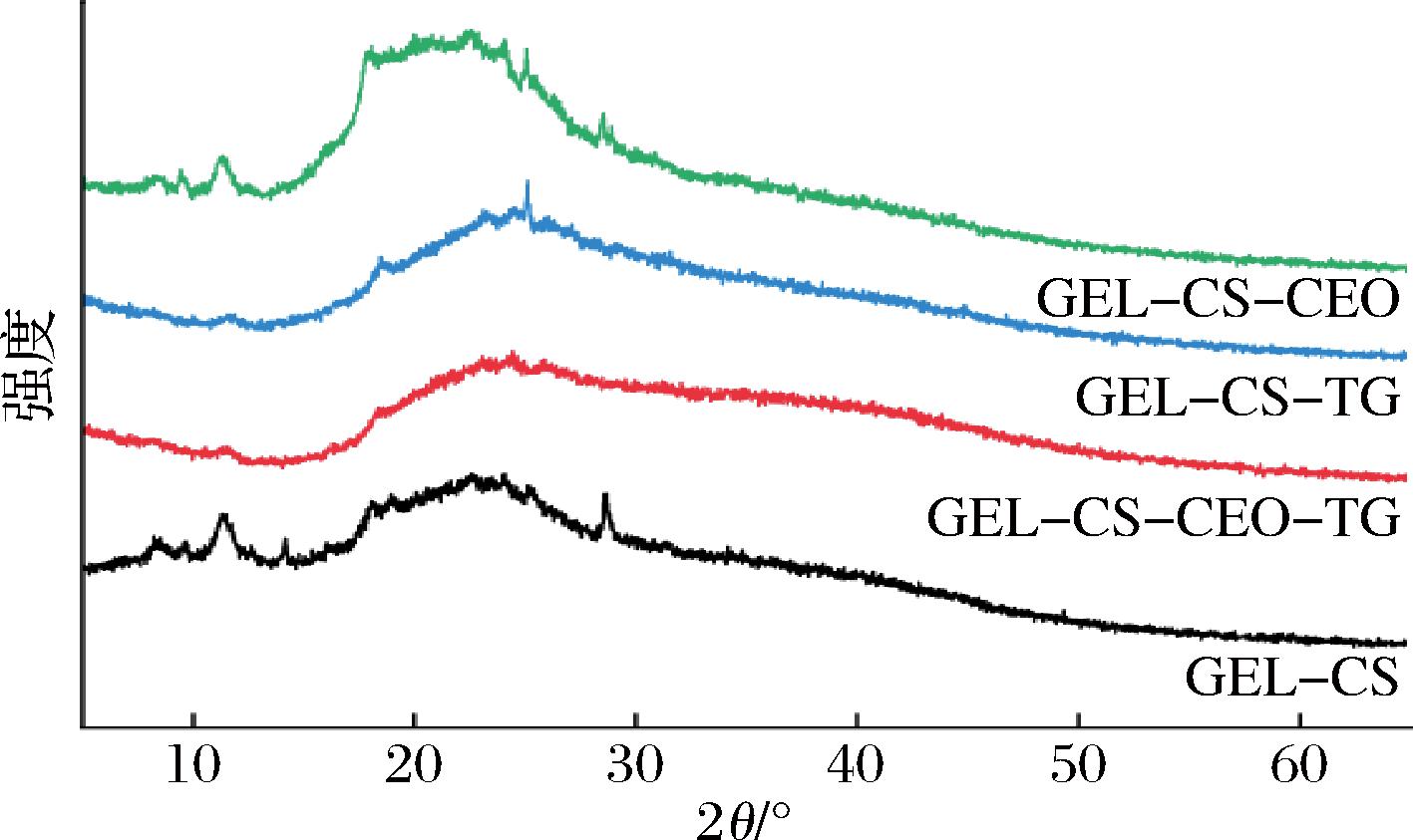 如图5所示,GEL-CS膜在2θ角处出现了7.82°、8.32°、11.36°、18.12°、20.54°和22.76°的衍射峰,这与GEL、CS的结晶状态一致[25]。GEL-CS-TG膜中上述衍射峰强度降低或消失,说明TG与GEL、CS之间形成了相互作用。GEL-CS-CEO膜峰形变得细窄尖锐,表明CEO的加入增强了膜的结晶度[26]。此外,GEL-CS-CEO-TG膜未观察到其他的衍射峰,这表明CEO和TG能够很好地与成膜基质融合,进一步证明了CEO和TG与2种基质之间的良好相容性。